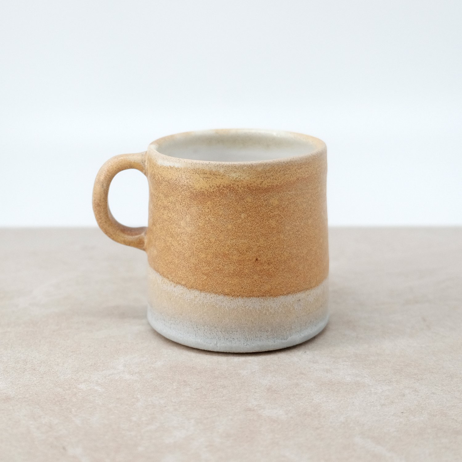 Individually thrown and hand modelled from vitrified stoneware clay and double dipped in orange, grey and white toned glazes.