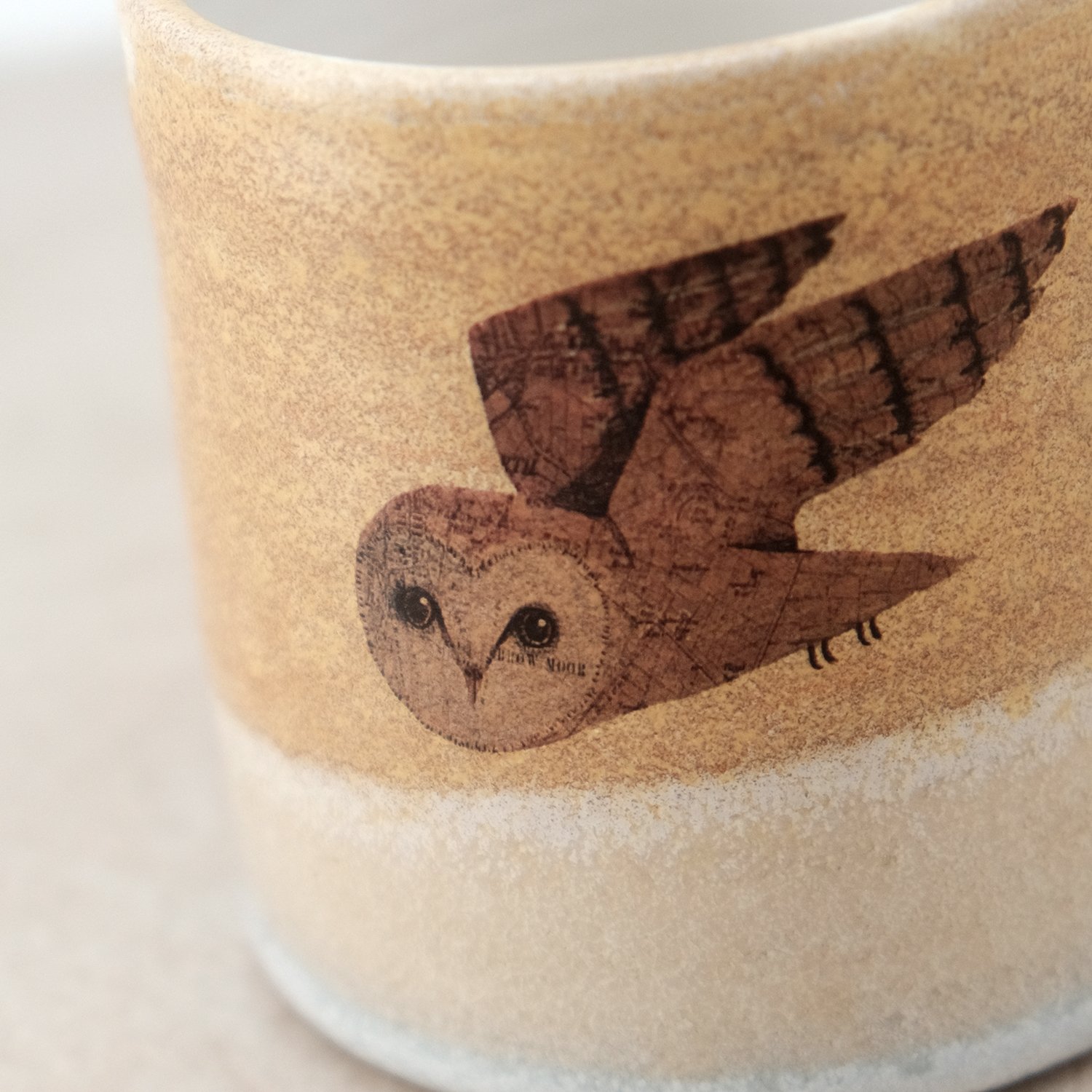 My barn owl illustration was reproduced as a decal and fired on to the glazed surface.