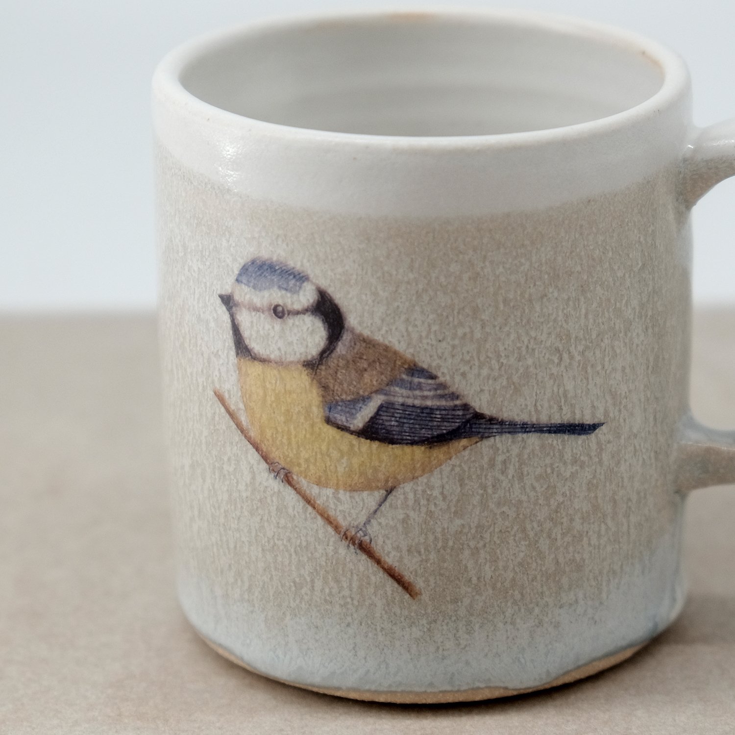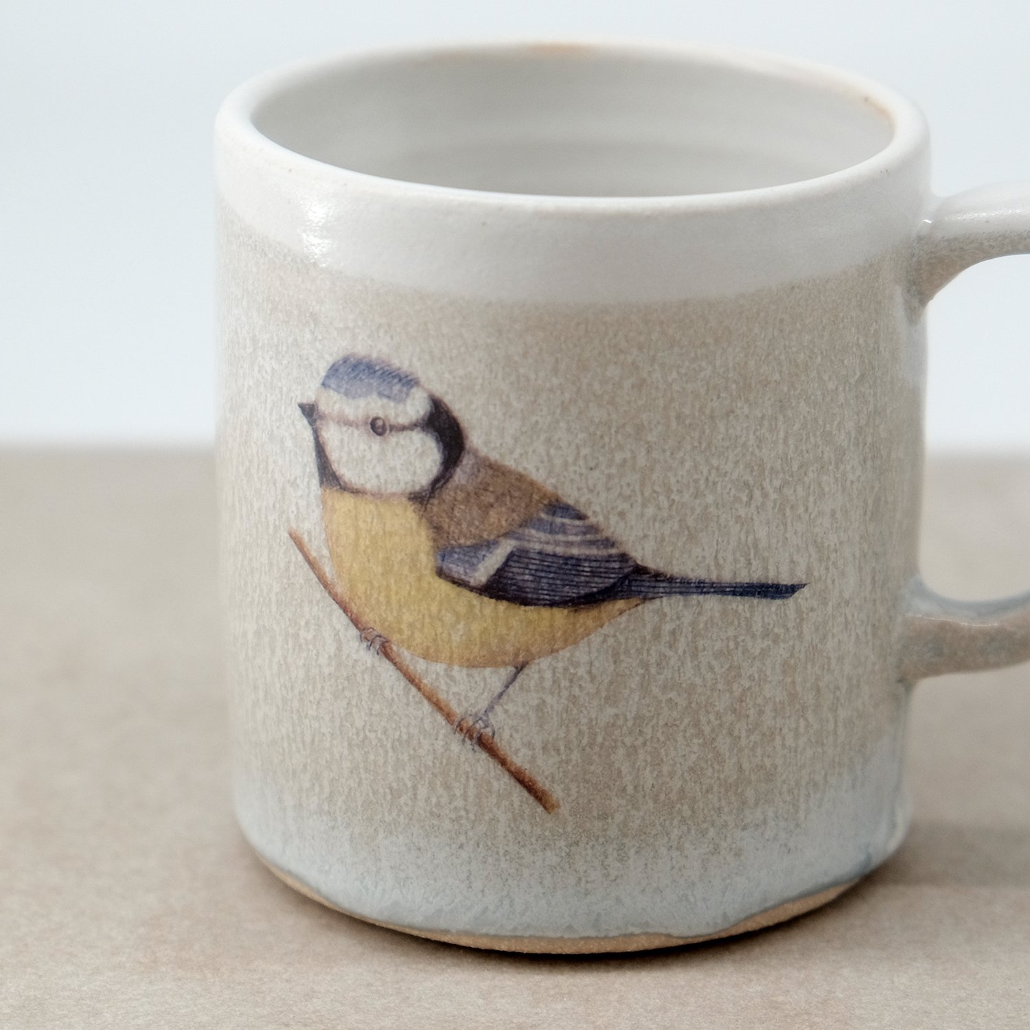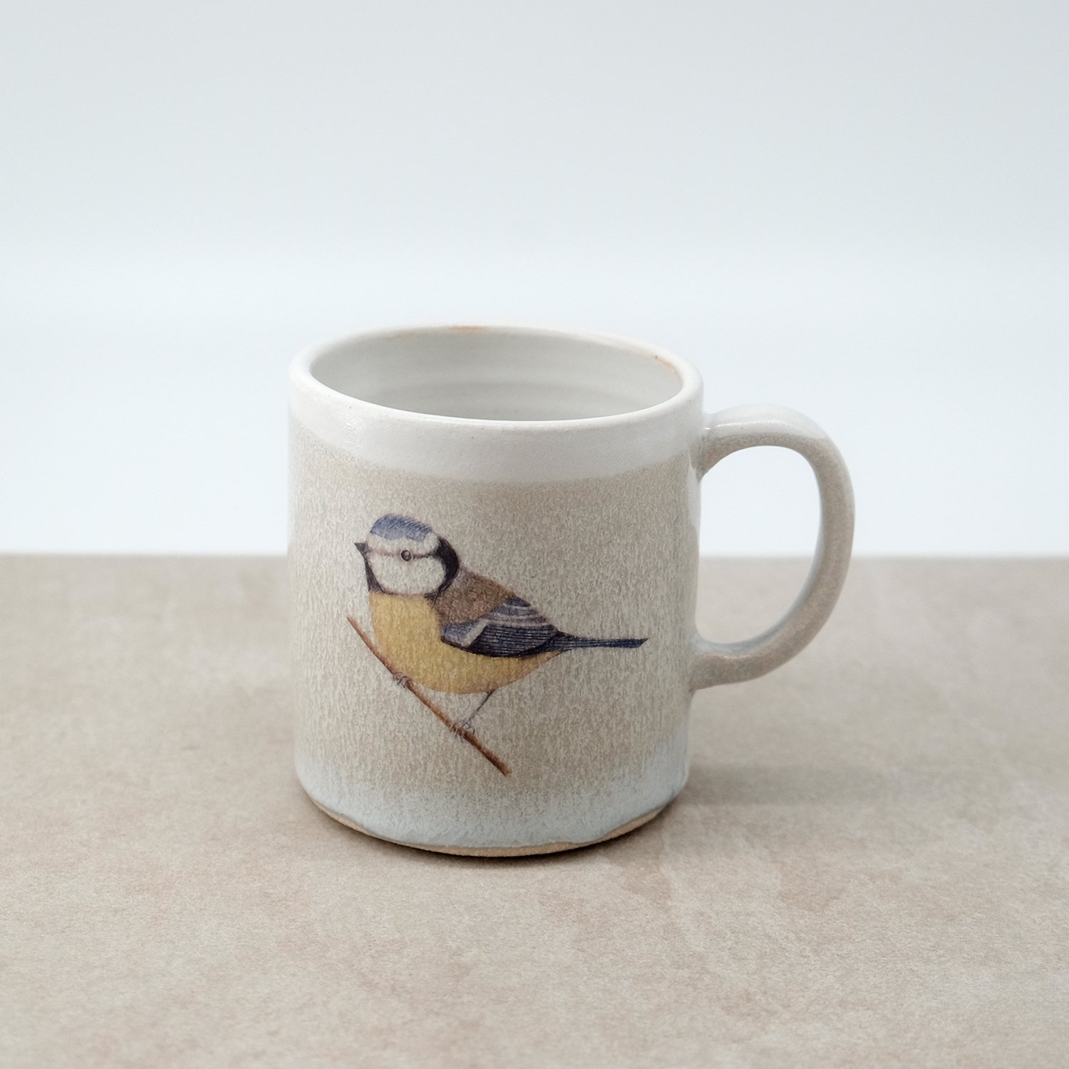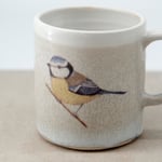 Each mug is individually wheel-thrown and hand-modelled from vitrified stoneware clay. It is double-dipped in white, cream and grey toned glazes, creating gentle variations that make every piece unique. My bluetit bird illustration is reproduced as a decal and carefully fired onto the glazed surface.