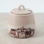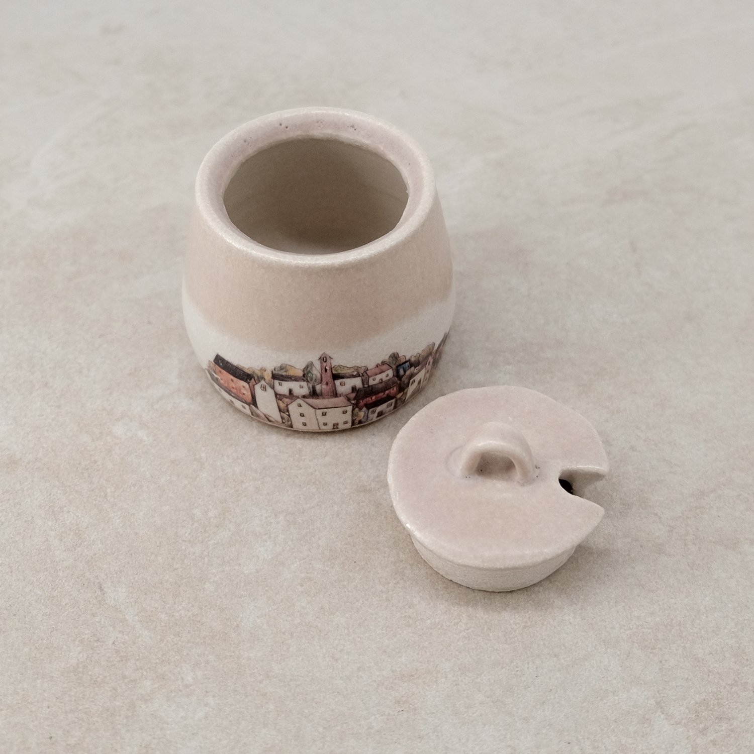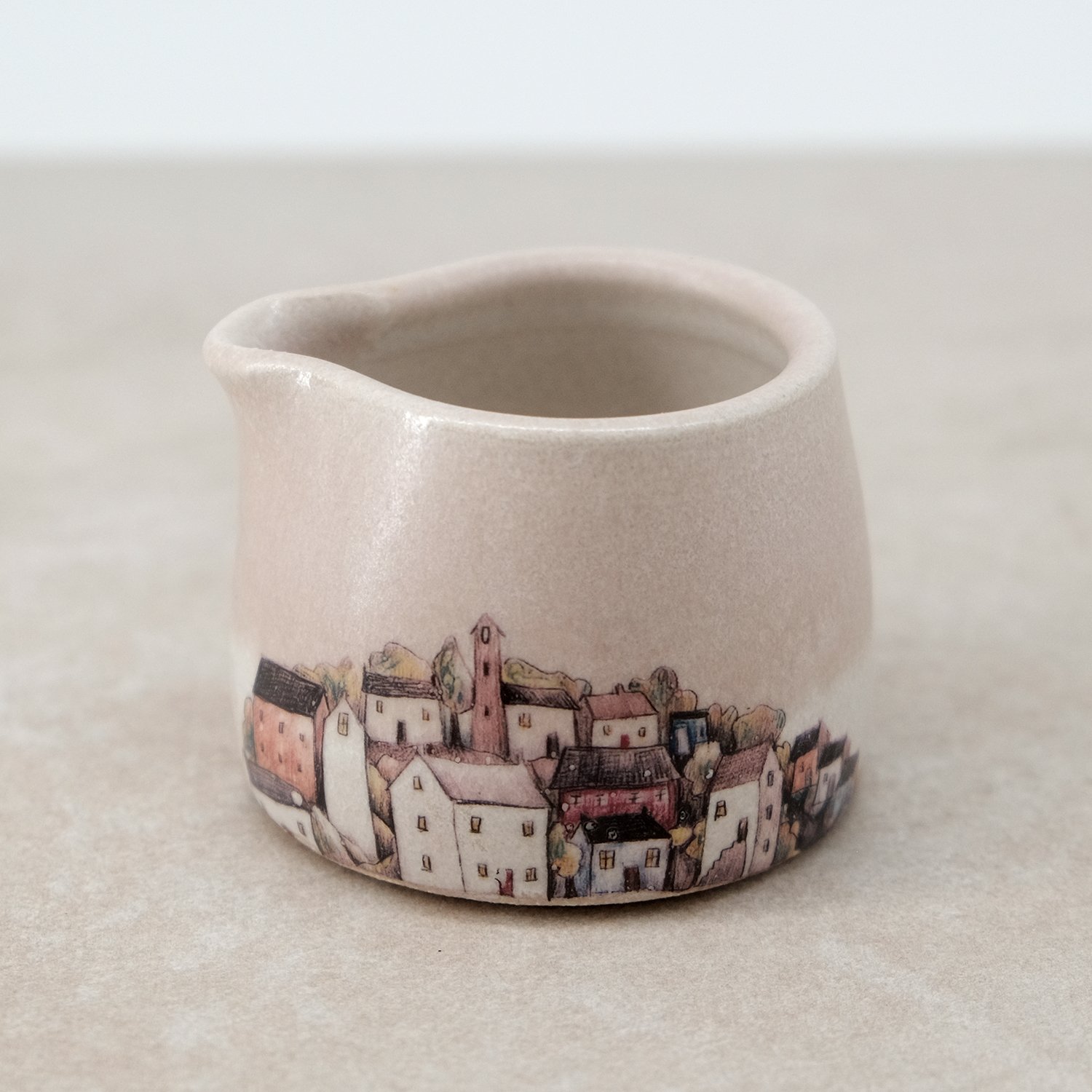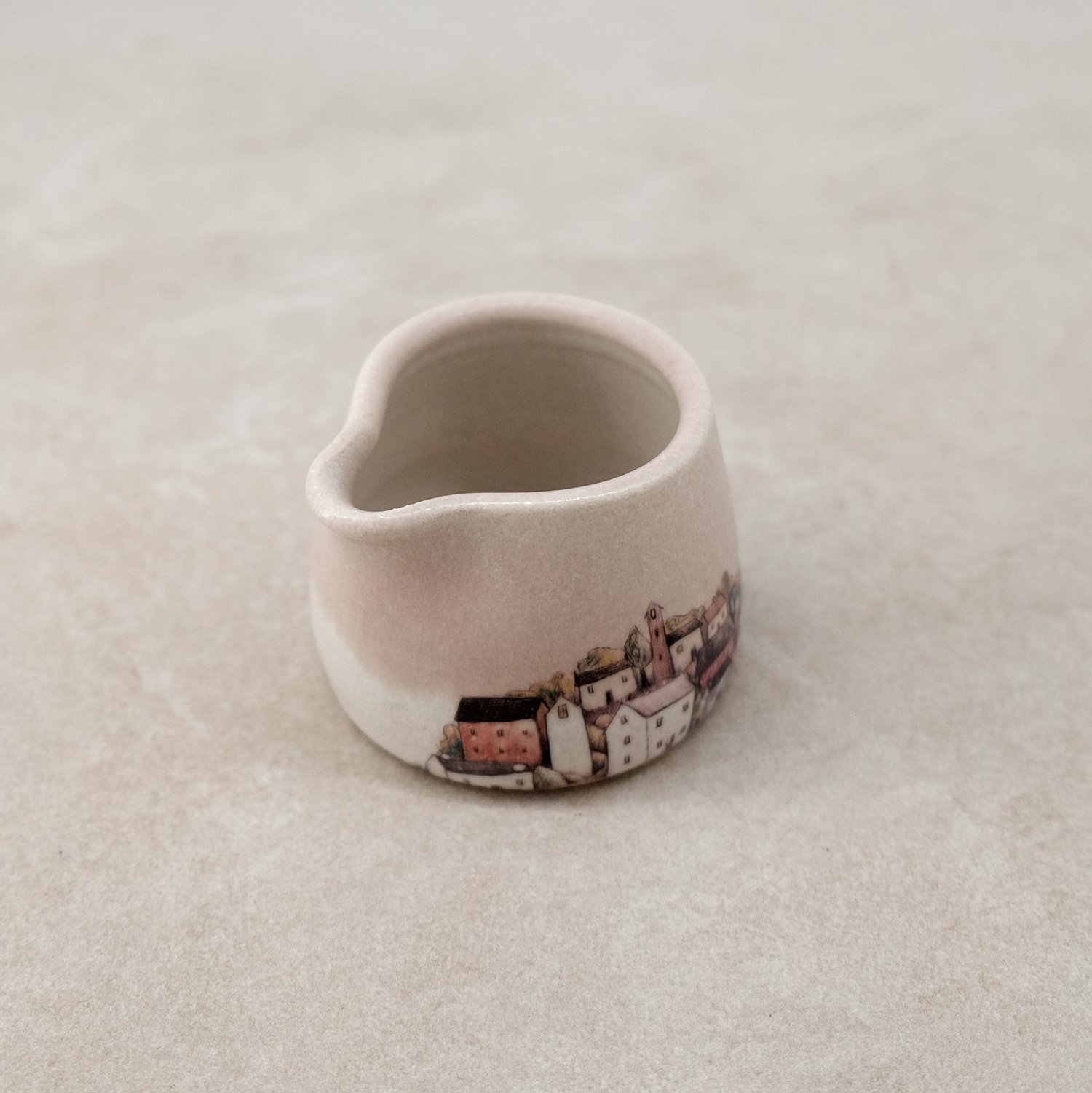 Each piece is individually wheel-thrown from stoneware clay and finished with soft stony white and pink-toned glazes. My coastal village illustration is reproduced as ceramic decals and fired onto the glazed surface.