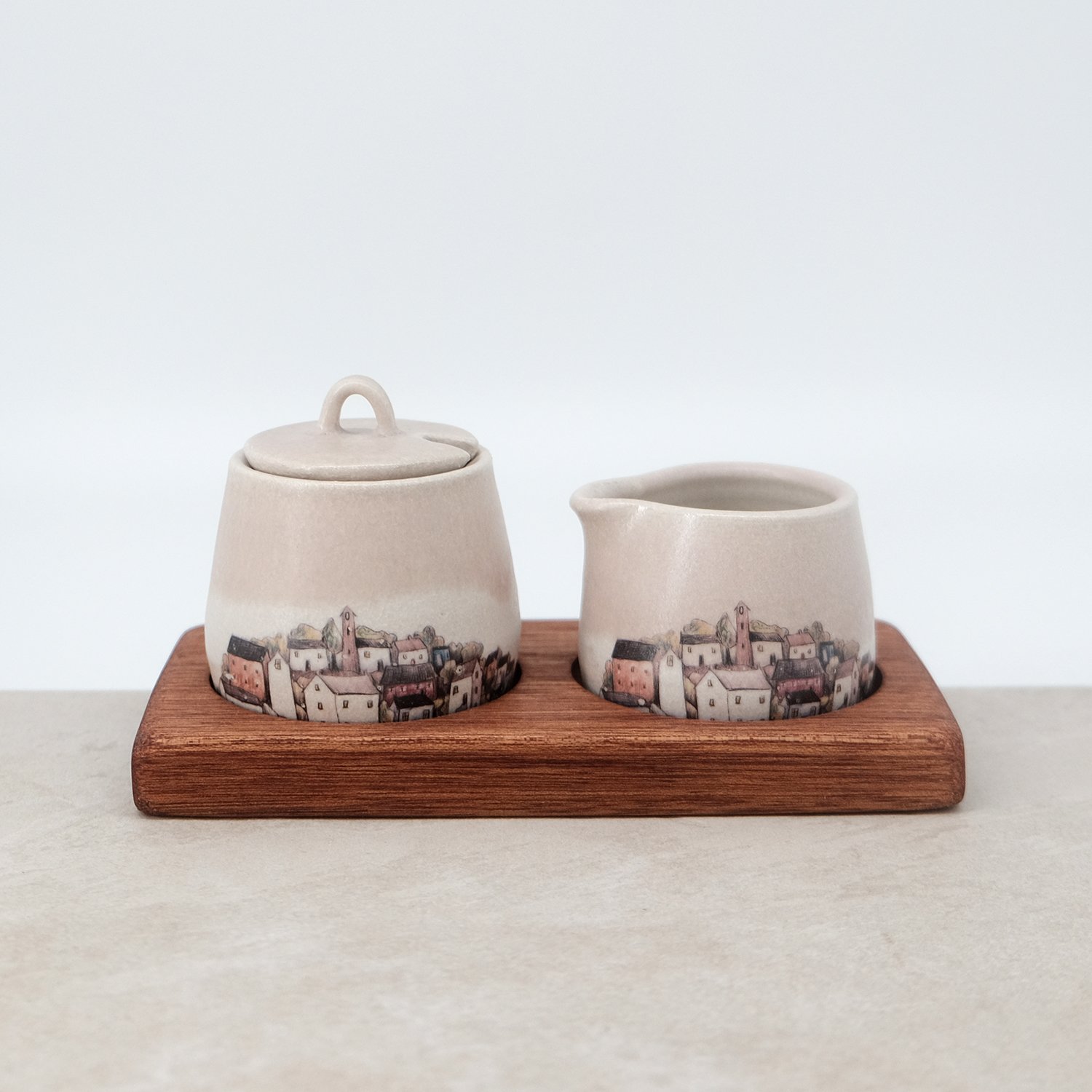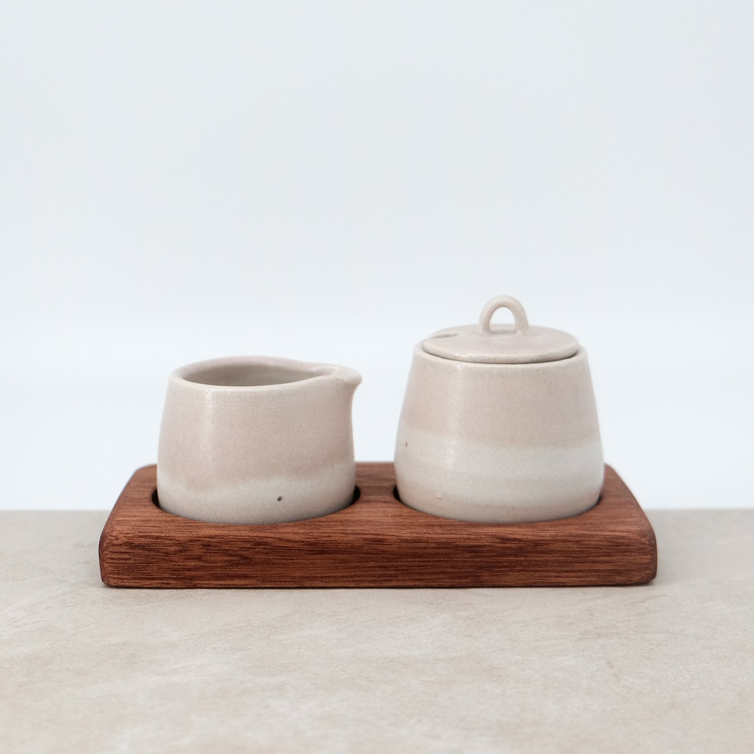 A handcrafted ceramic lidded pot and mini pourer, presented on a hand-routered hardwood tray. Designed for serving milk and sugar alongside tea or coffee.