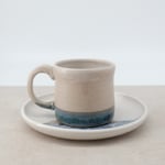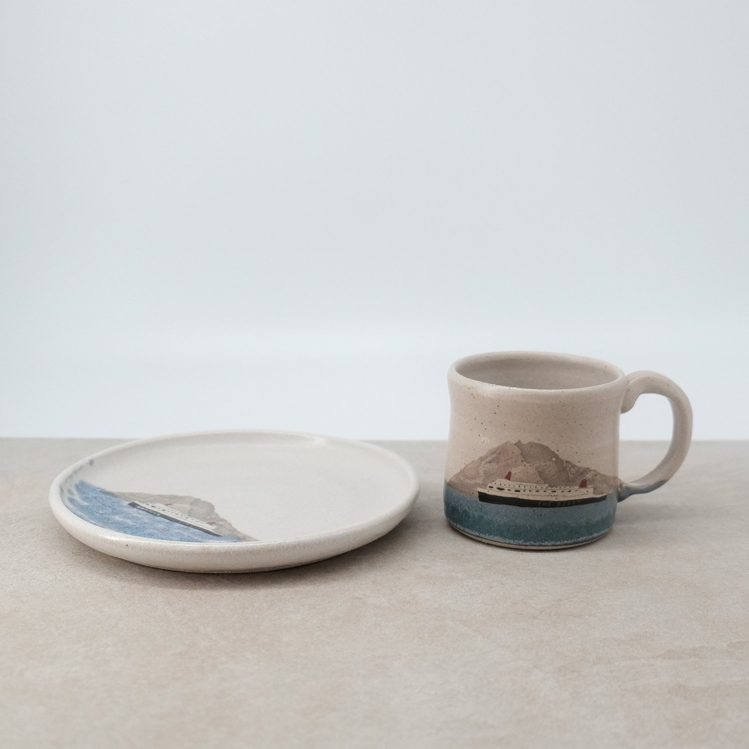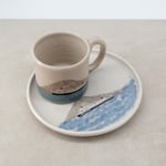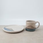 A simple mug and plate, with layered glaze finishes and hand drawn decal prints. Perfect for breakfast time. Please see dimensions below.