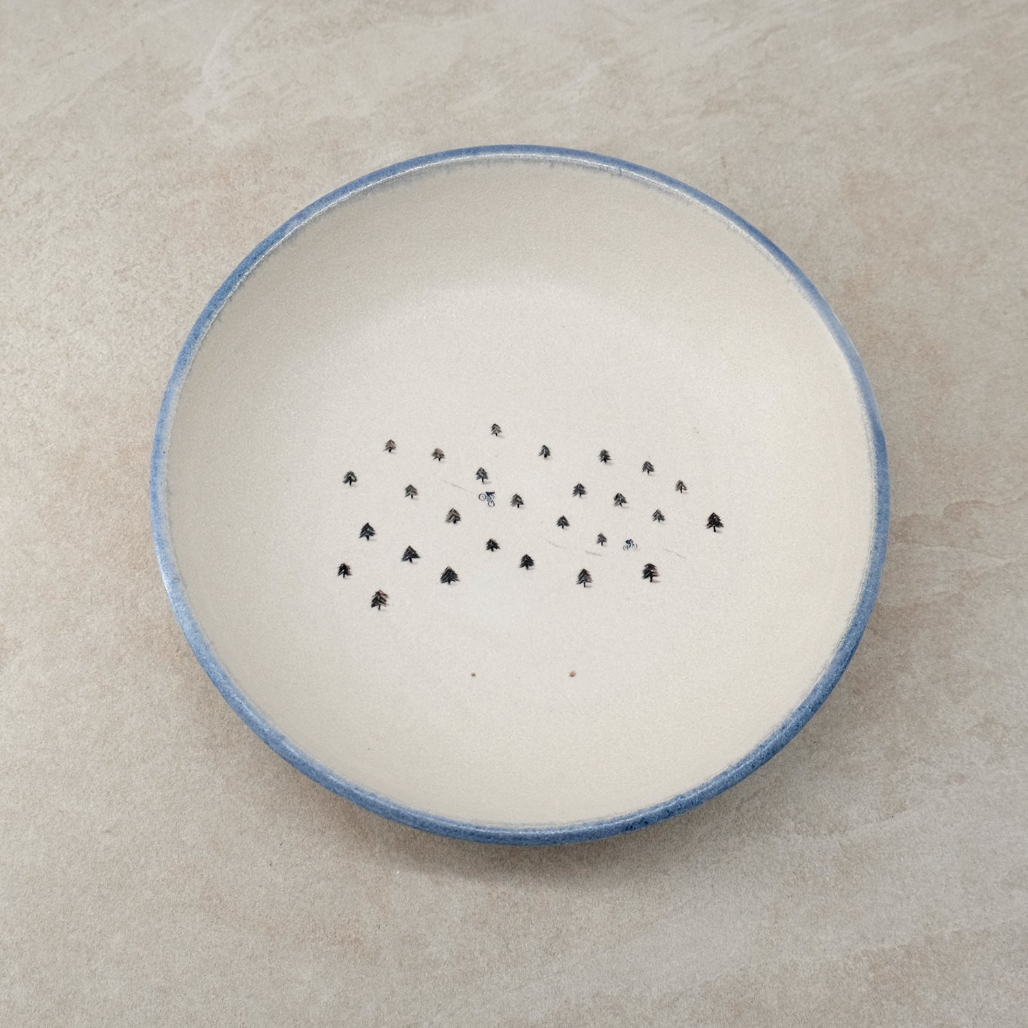 A medium large bowl, with a stony glaze finish and hand drawn decal print. Please see dimensions below.