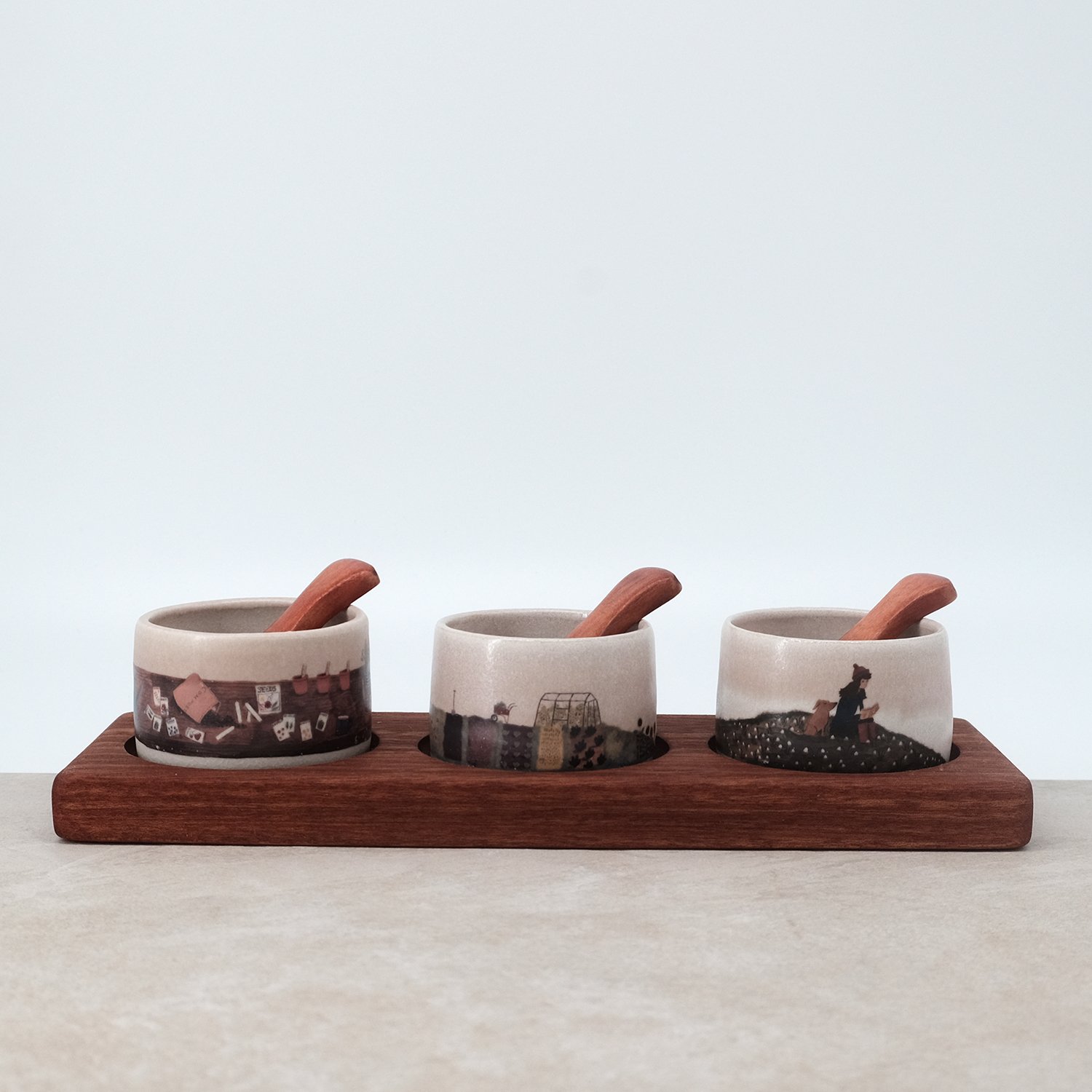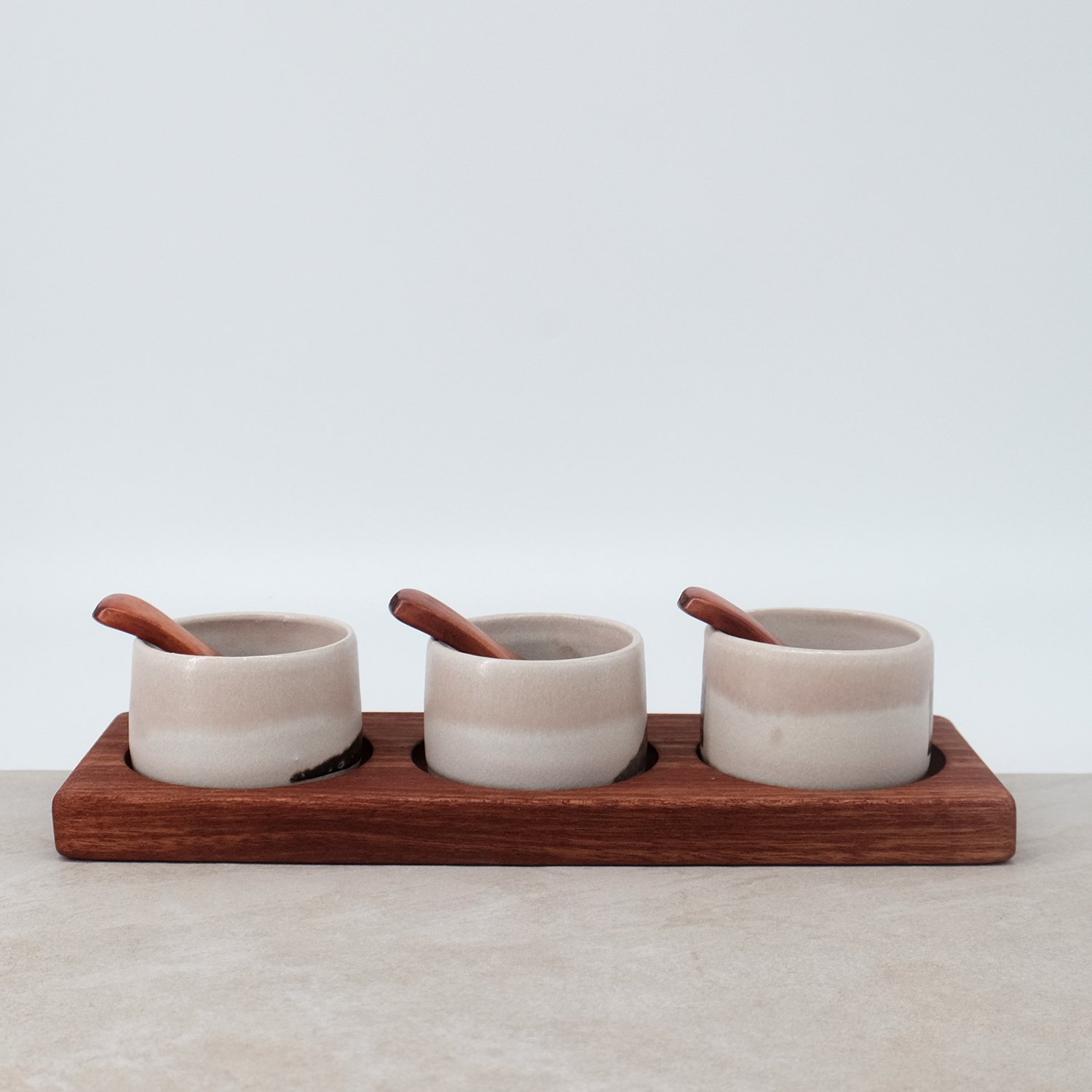 A set of three handcrafted bowls on a hand routered hardwood tray. A perfect set for serving dips, chutneys or seasonings with wooden spoons included.