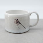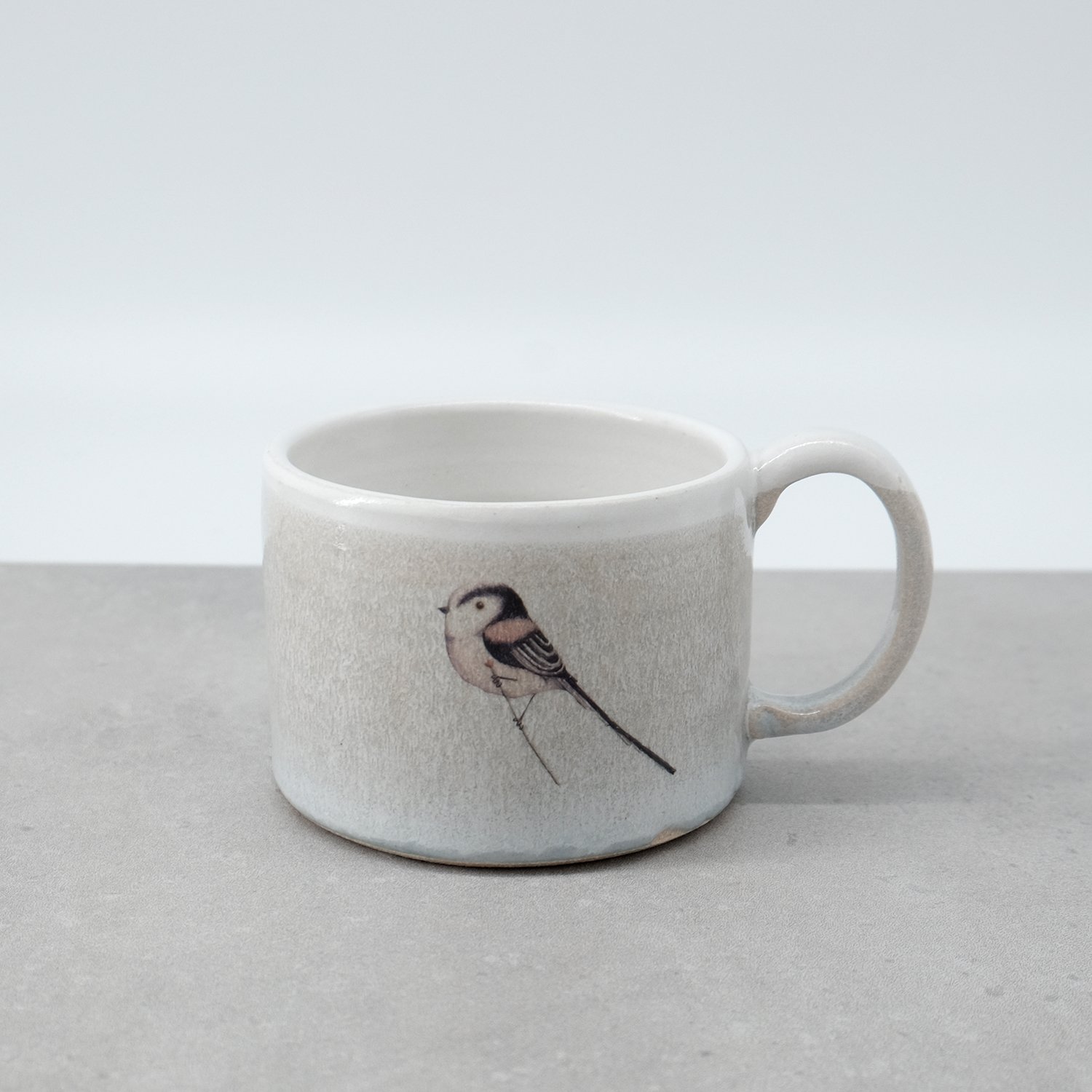 Each mug is individually wheel-thrown and hand-modelled from vitrified stoneware clay. It is double-dipped in white, cream and grey toned glazes, creating gentle variations that make every piece unique. My long tailed tit illustration is reproduced as a decal and carefully fired onto the glazed surface.