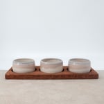 A set of three handcrafted bowls on a hand routered hardwood tray. A versatile set for serving condiments alongside a big family meal.