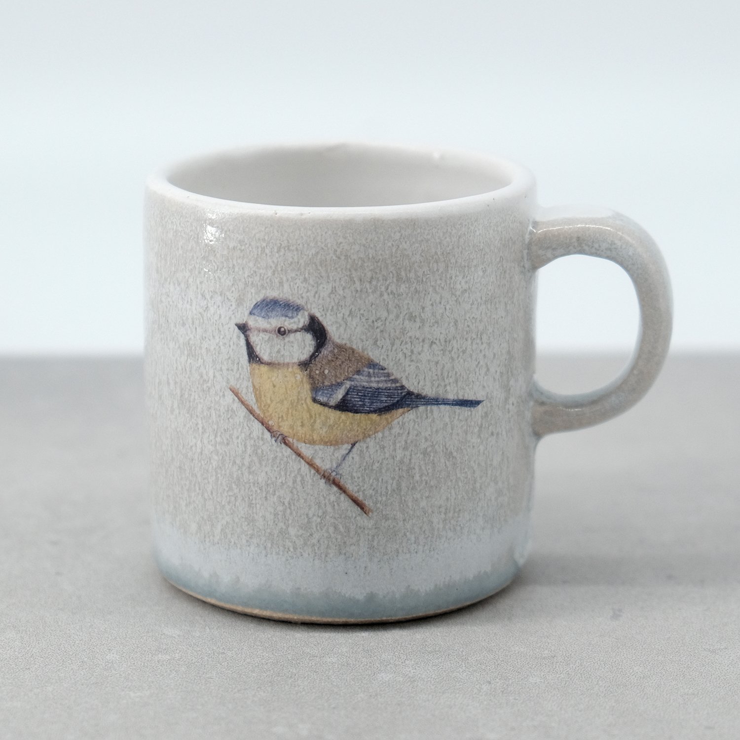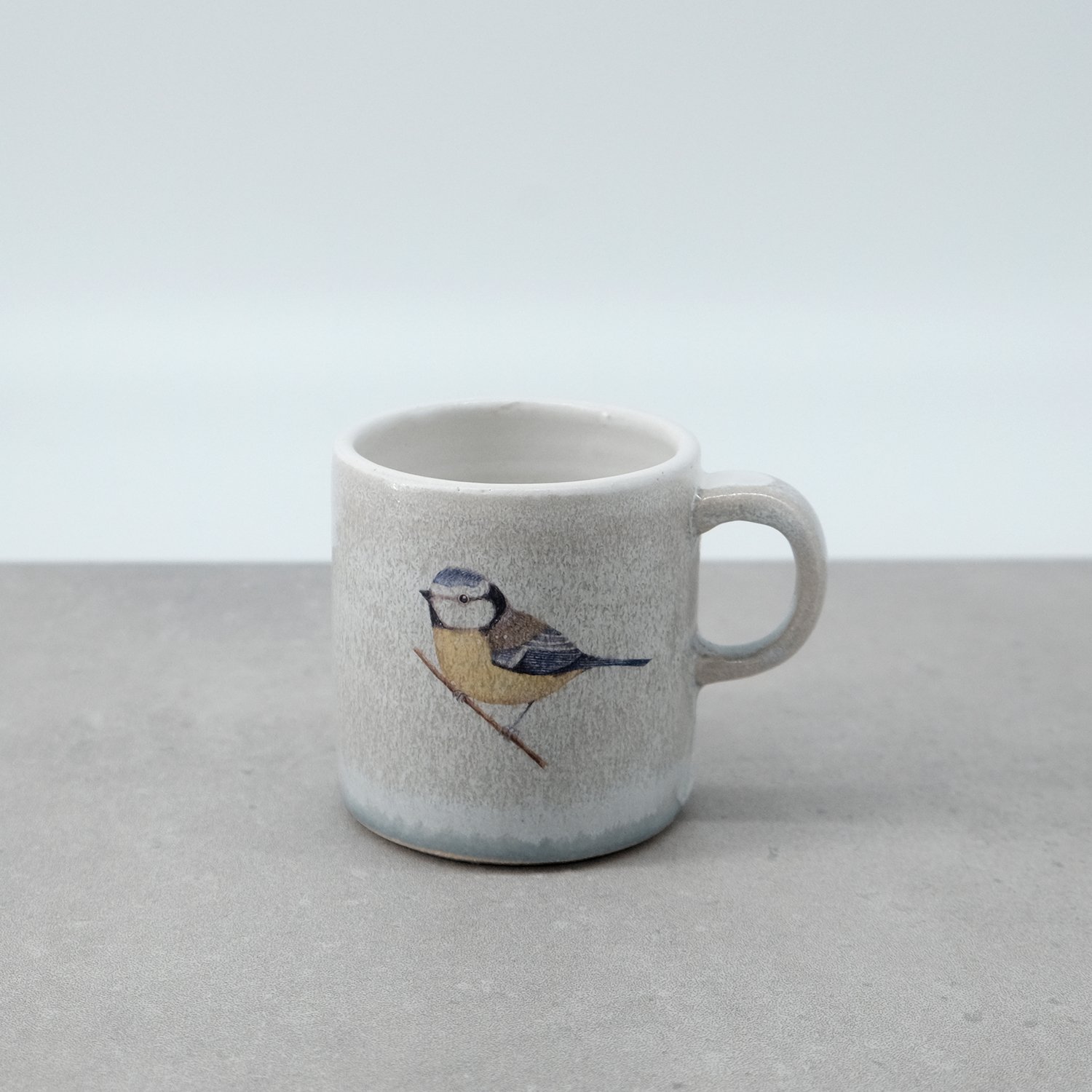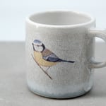 Each mug is individually wheel-thrown and hand-modelled from vitrified stoneware clay. It is double-dipped in white, cream and grey toned glazes, creating gentle variations that make every piece unique. My blue tit illustration is reproduced as a decal and carefully fired onto the glazed surface.