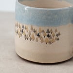 Individually thrown and hand modelled from vitrified earthenware and double dipped in blue and tan toned glazes.