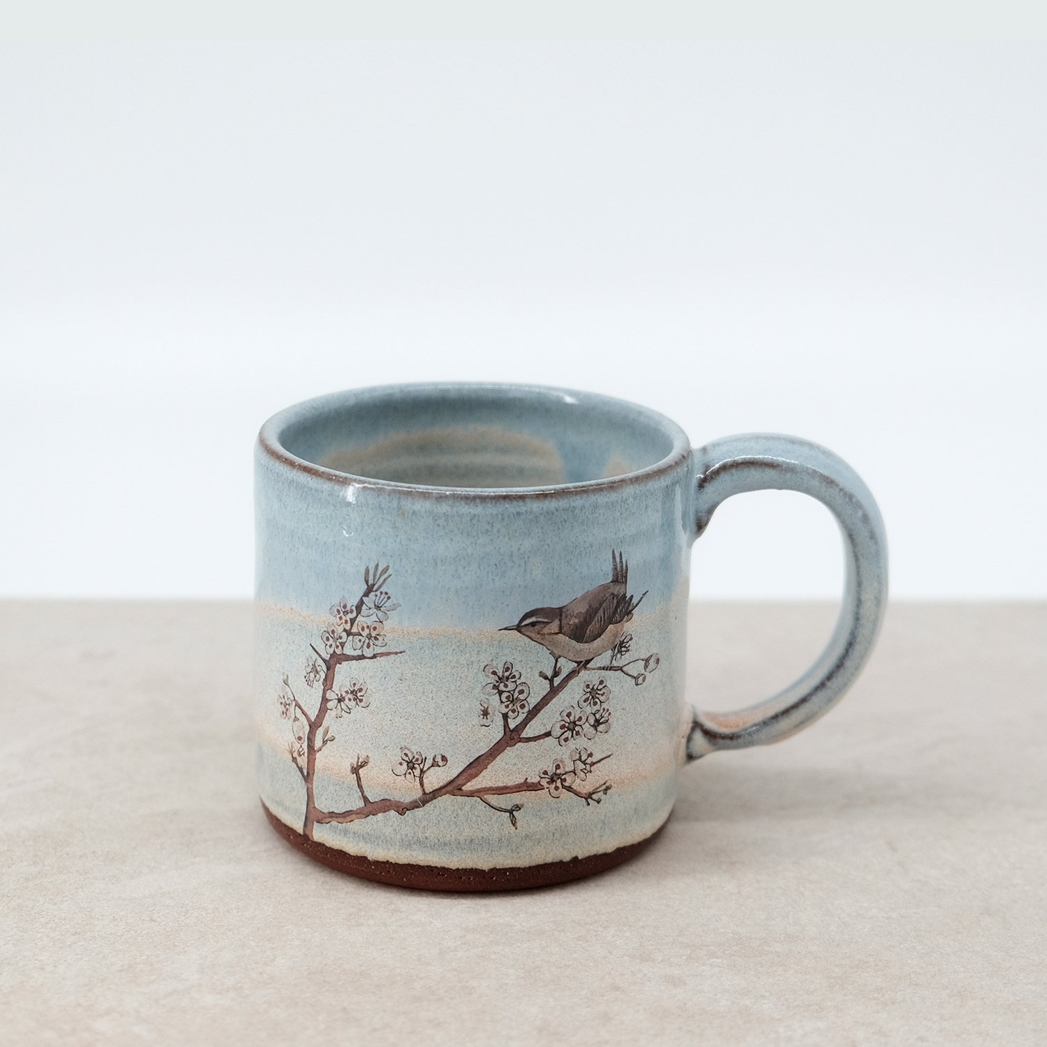 My wren on blackthorn branch illustration was reproduced as a decal and fired on to the glazed surface.