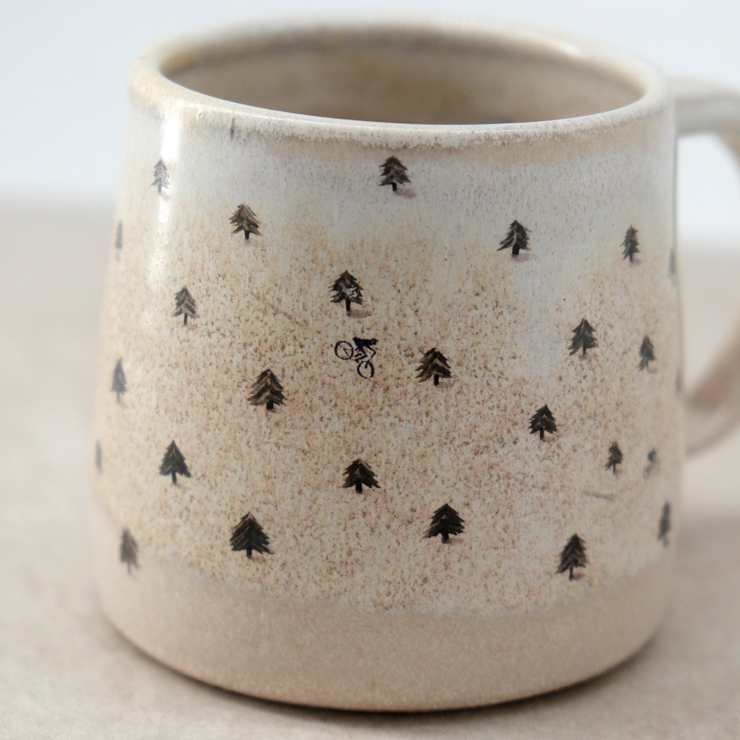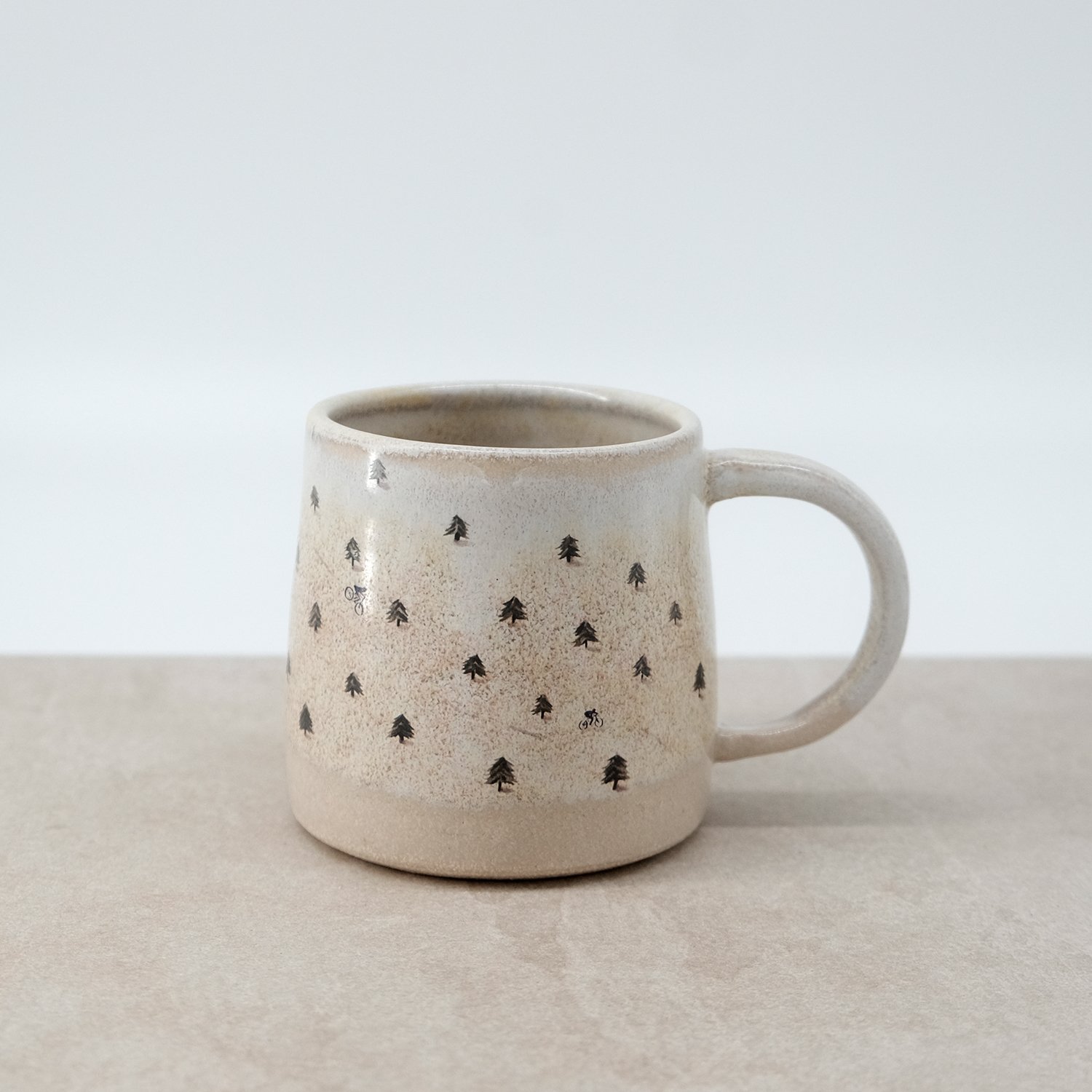 Each mug is individually wheel-thrown and hand-modelled from vitrified stoneware clay. It is double-dipped in cream and white toned glazes, creating gentle variations that make every piece unique. My mountain bikers in forest illustration is reproduced as a decal and carefully fired onto the glazed surface.