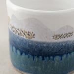 Each mug is individually wheel-thrown and hand-modelled from vitrified stoneware clay. It is double-dipped in stony white and blue toned glazes, creating gentle variations that make every piece unique. My mountains illustration is reproduced as a decal and carefully fired onto the glazed surface.