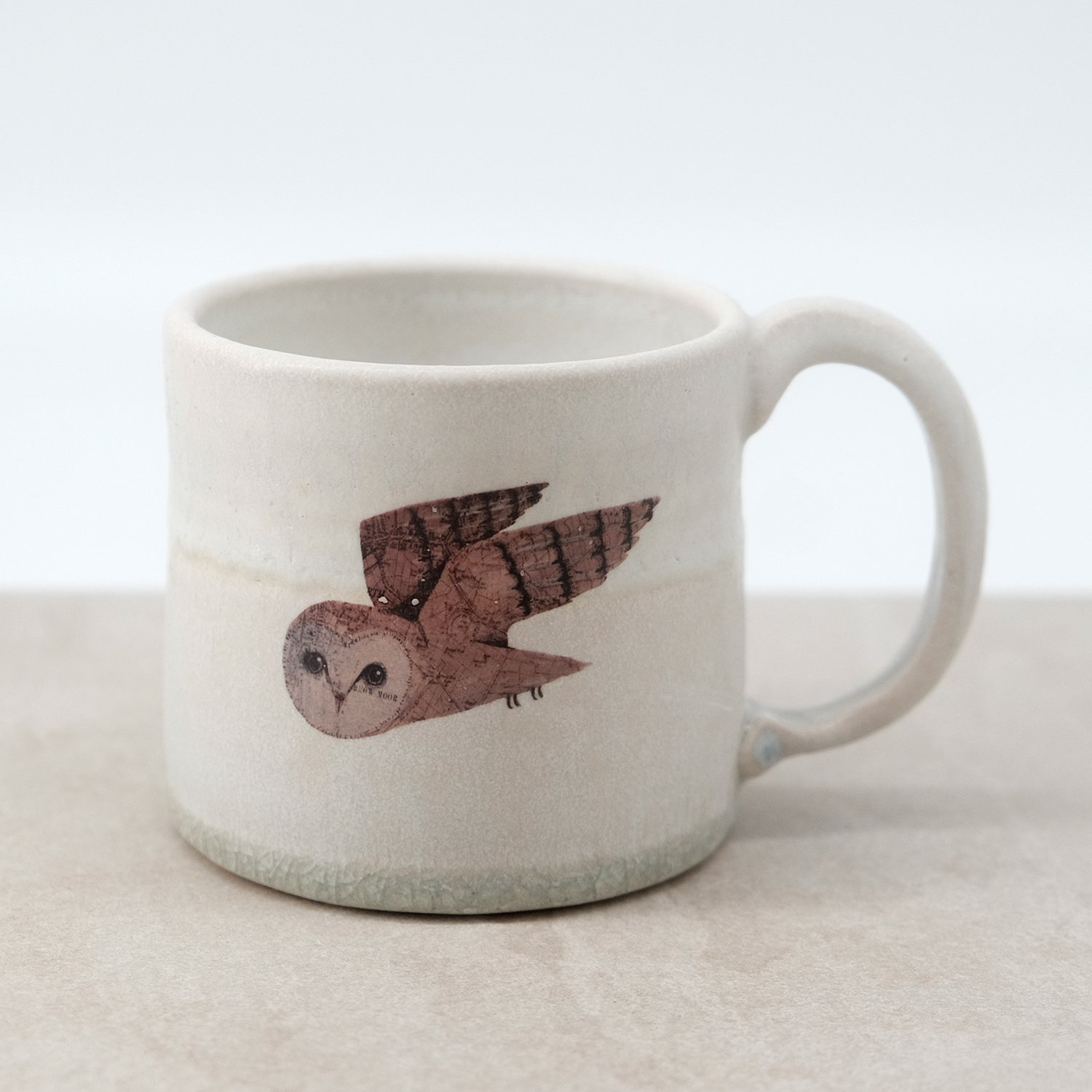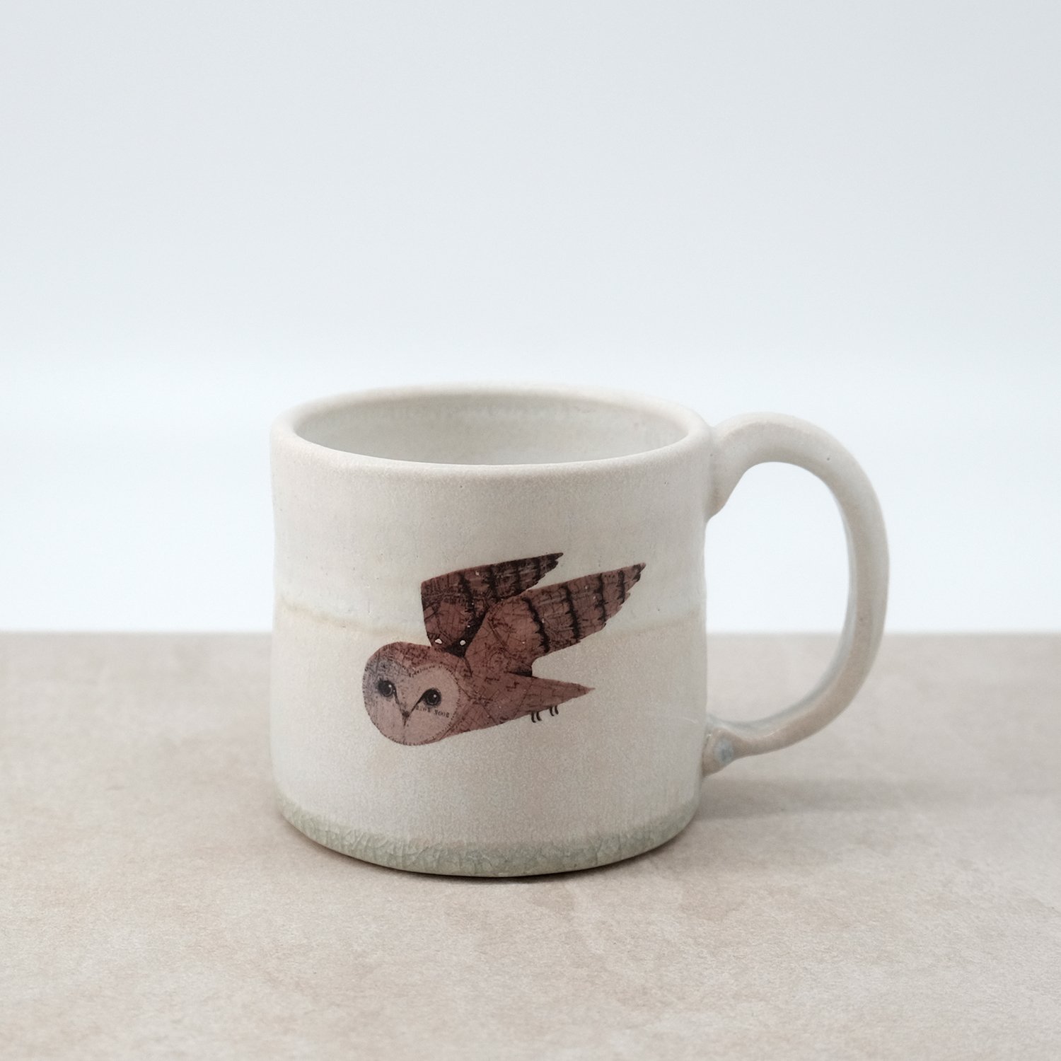 My barn owl branch illustration was reproduced as a decal and fired on to the glazed surface.