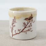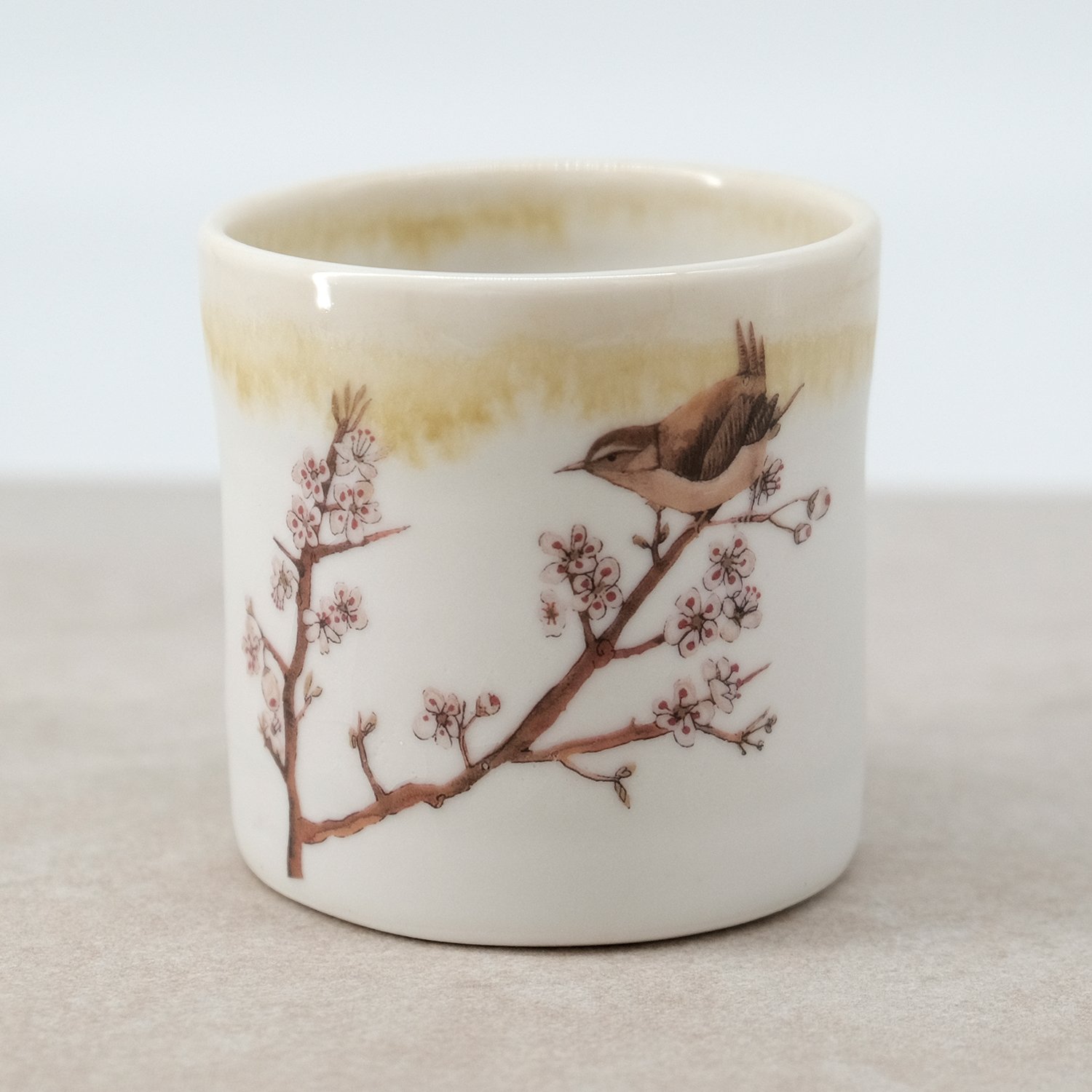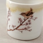My wren on blackthorn branch illustration was reproduced as a decal and fired on to the glazed surface.