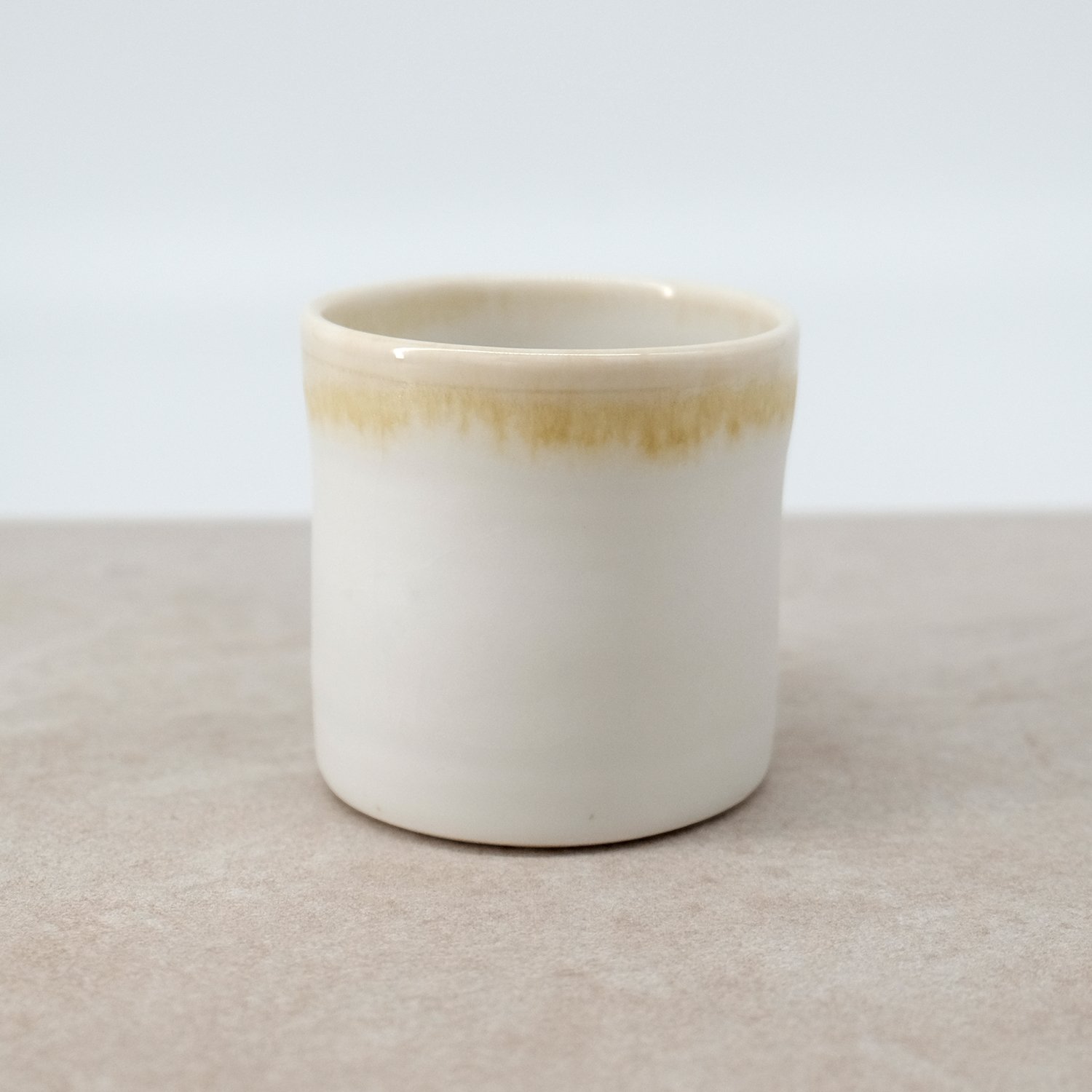 Individually thrown from vitrified smooth white porcelain clay and decorated with stony white and amber glaze.
