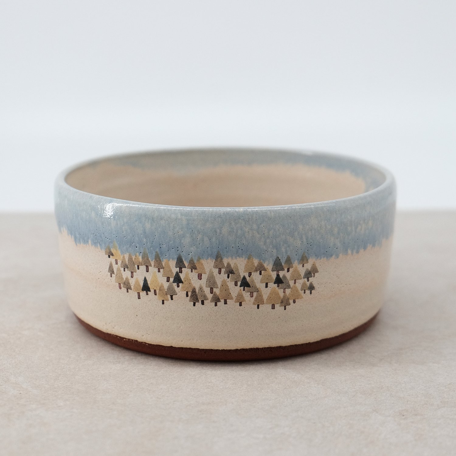 A straight sided cereal bowl, with a layered glaze finish and hand drawn decal print. Perfect for breakfast, soup or pudding.