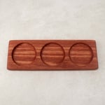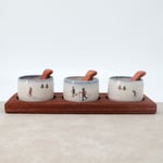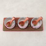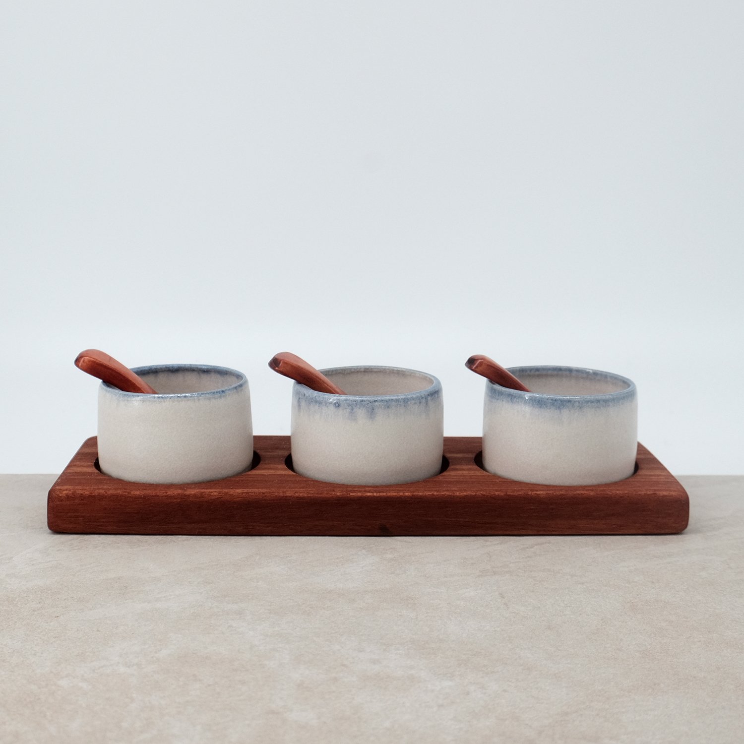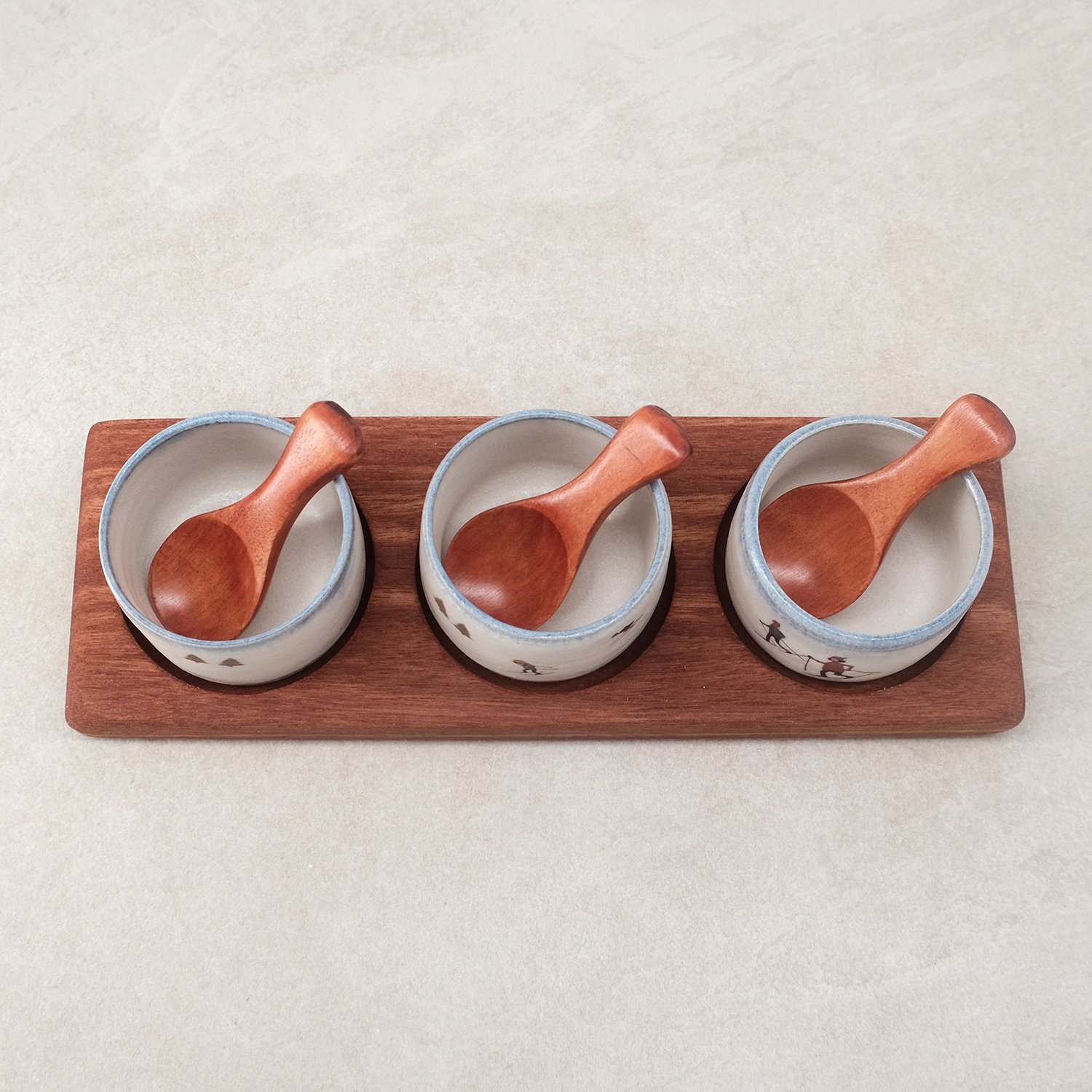 A set of three handcrafted bowls on a hand routered hardwood tray. A perfect set for serving dips, chutneys or seasonings with wooden spoons included.