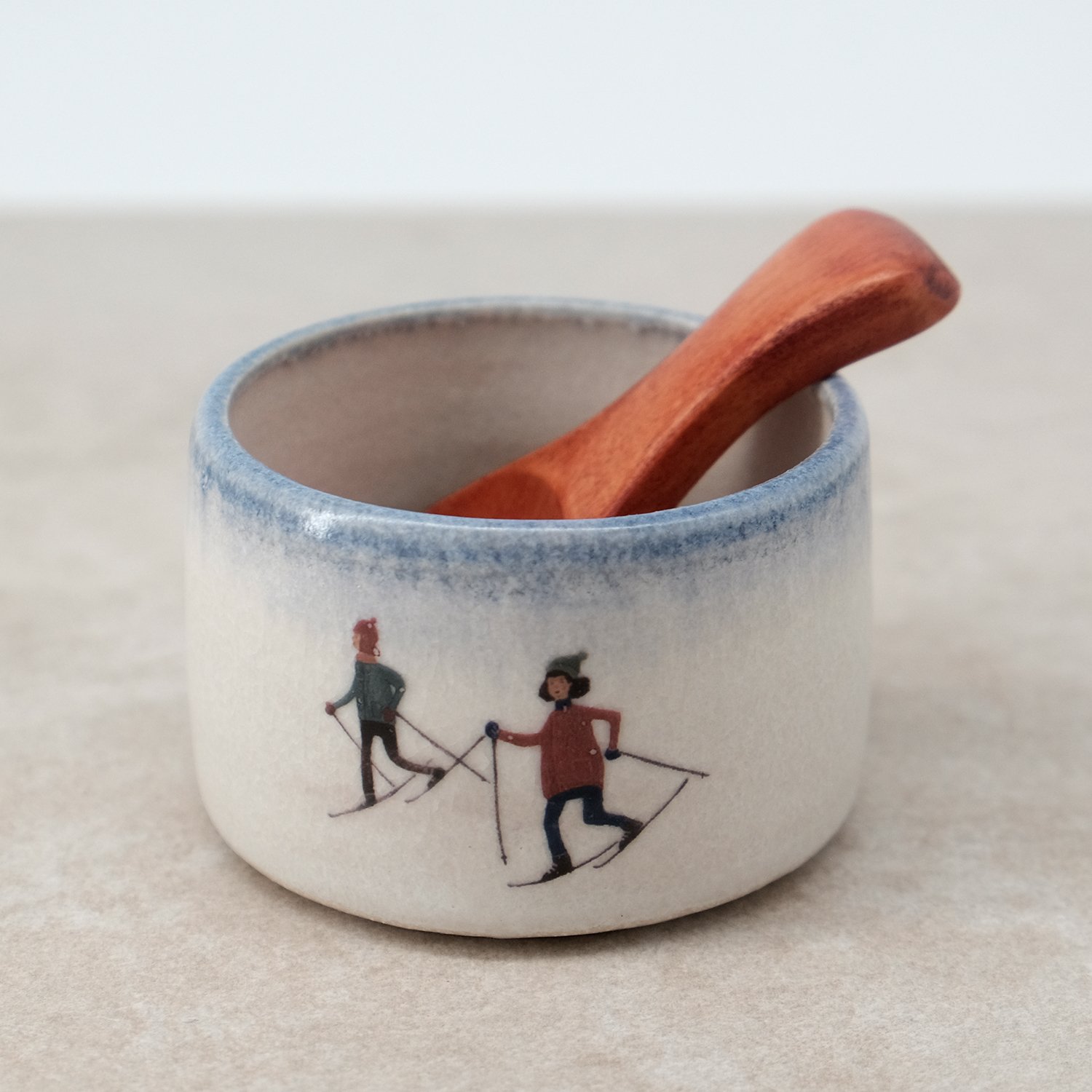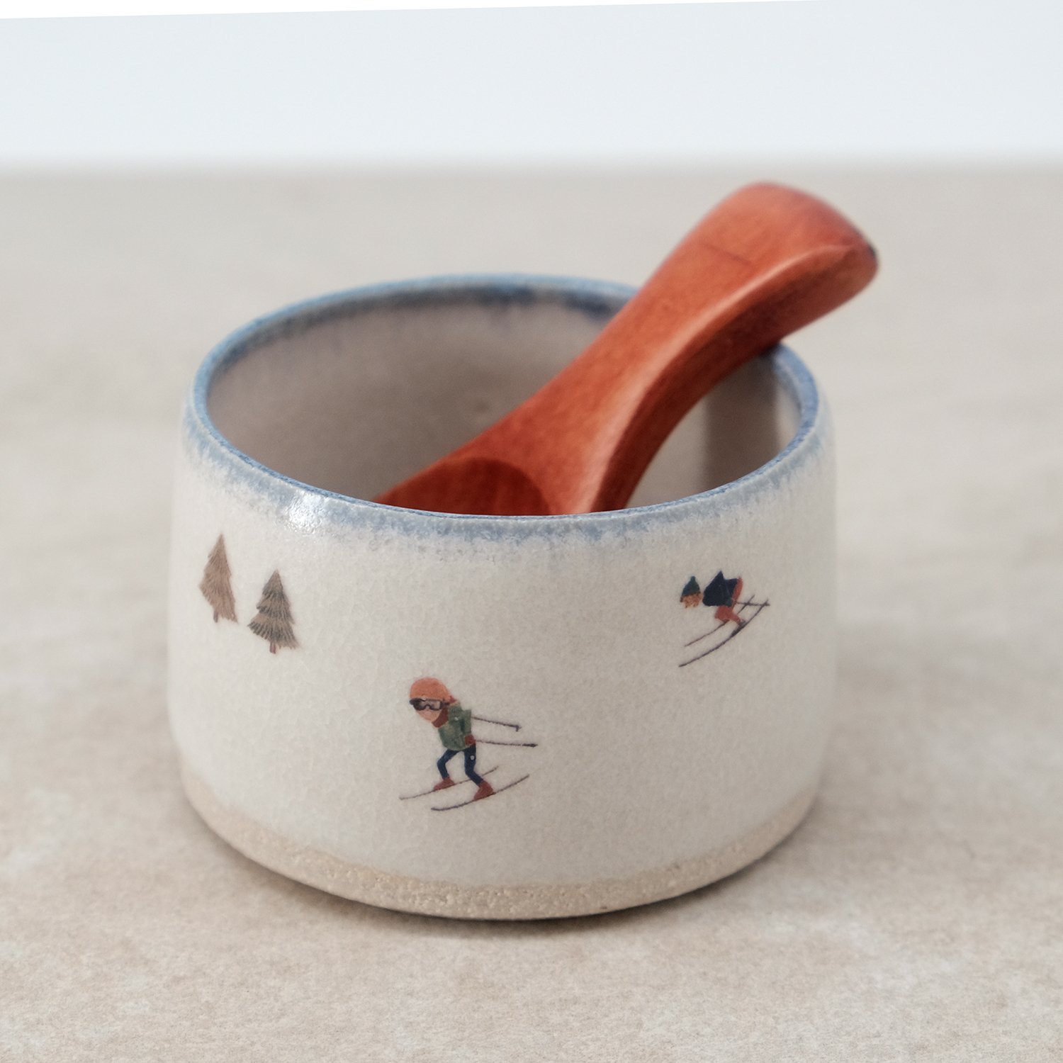 My skier illustrations were reproduced as decals and fired on to the glazed surface.
