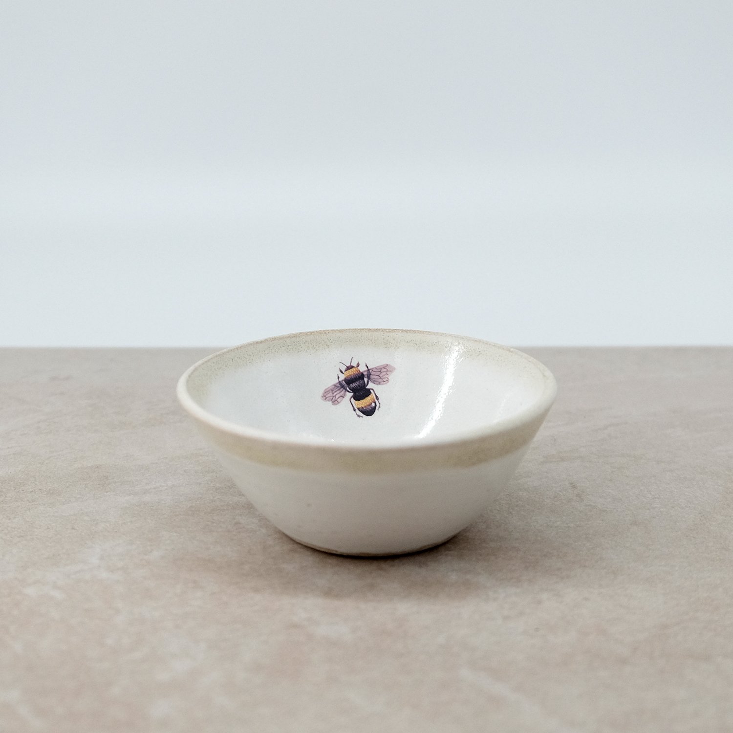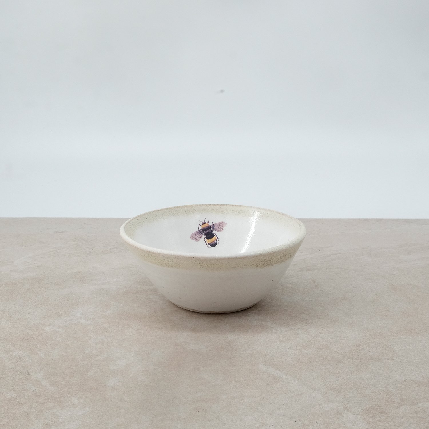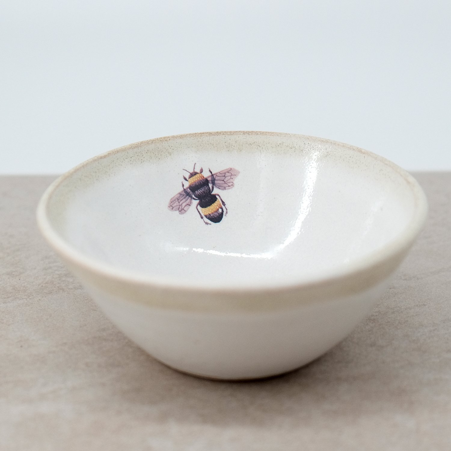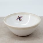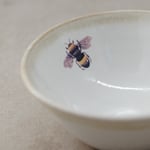 This bowl was individually wheel-thrown from vitrified stoneware clay. It is double-dipped in white and cream toned glazes, creating gentle variations that make every piece unique. My bee illustration is reproduced as a decal and carefully fired onto the glazed surface.