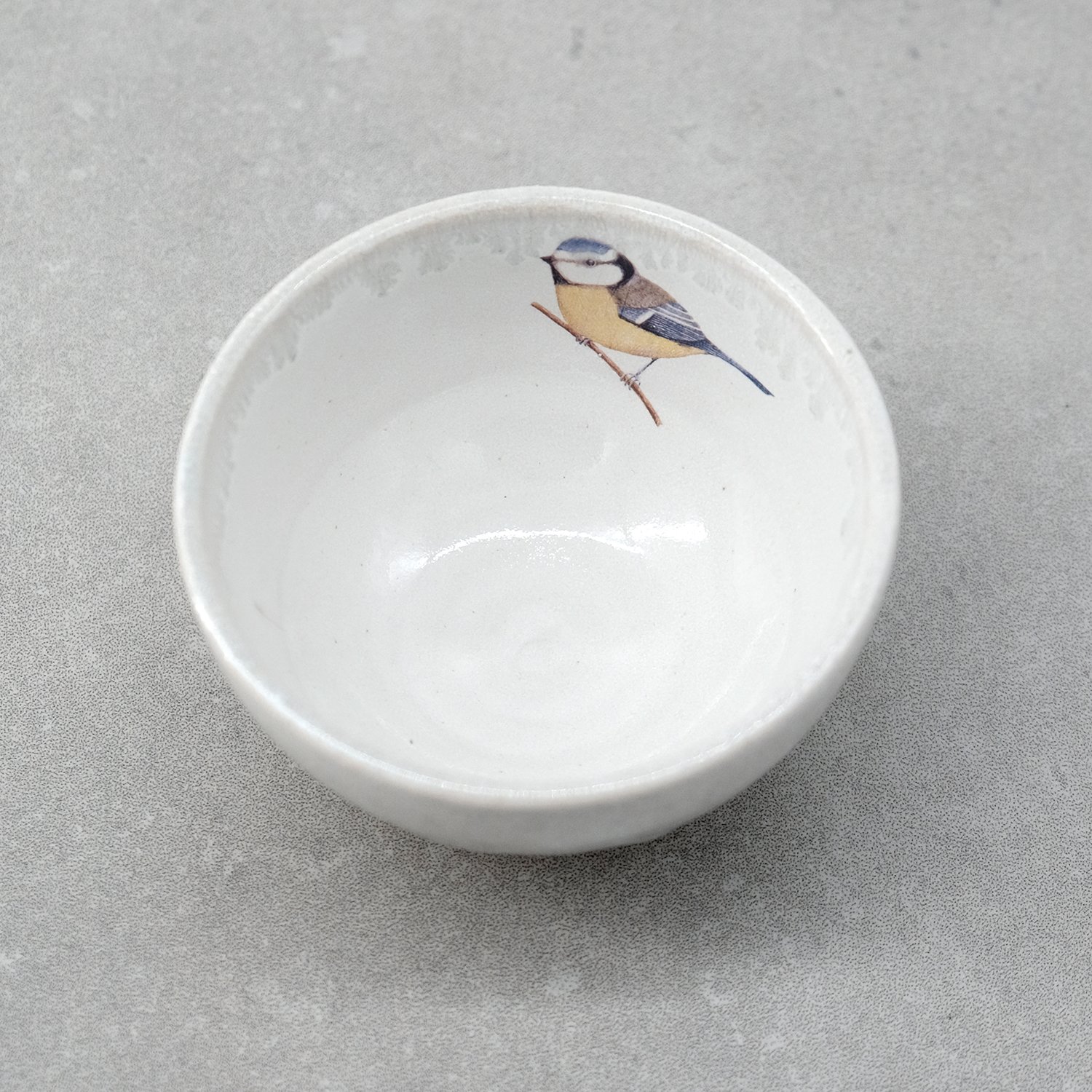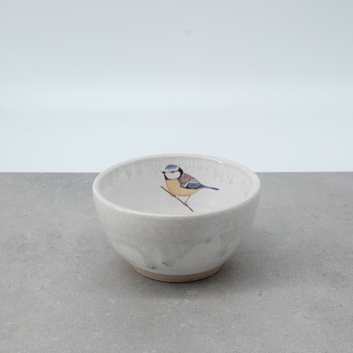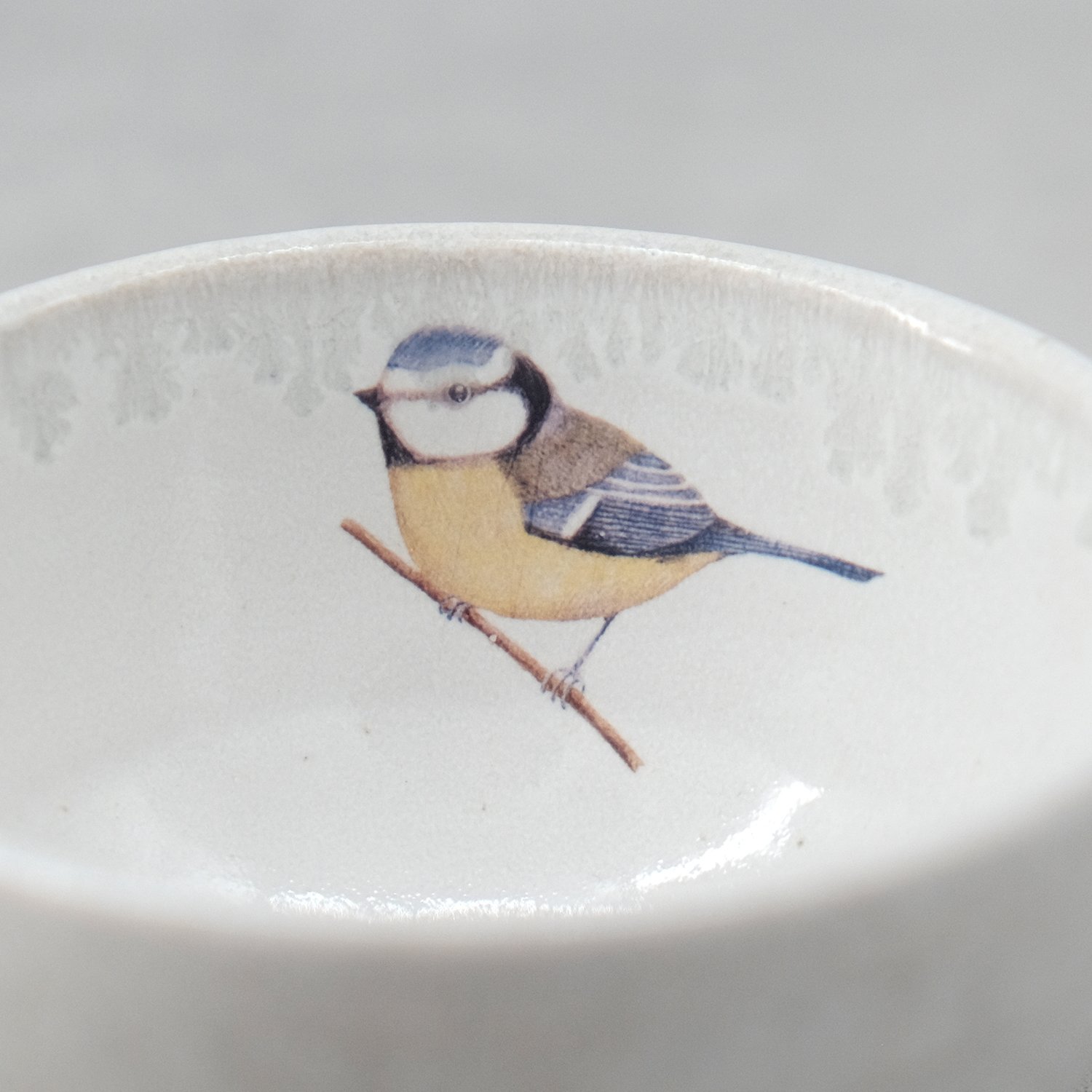 This bowl was individually wheel-thrown from vitrified stoneware clay. It is double-dipped in white and light grey toned glazes, creating gentle variations that make every piece unique. My blue tit illustration is reproduced as a decal and carefully fired onto the glazed surface.
