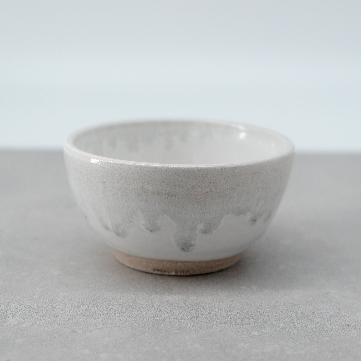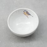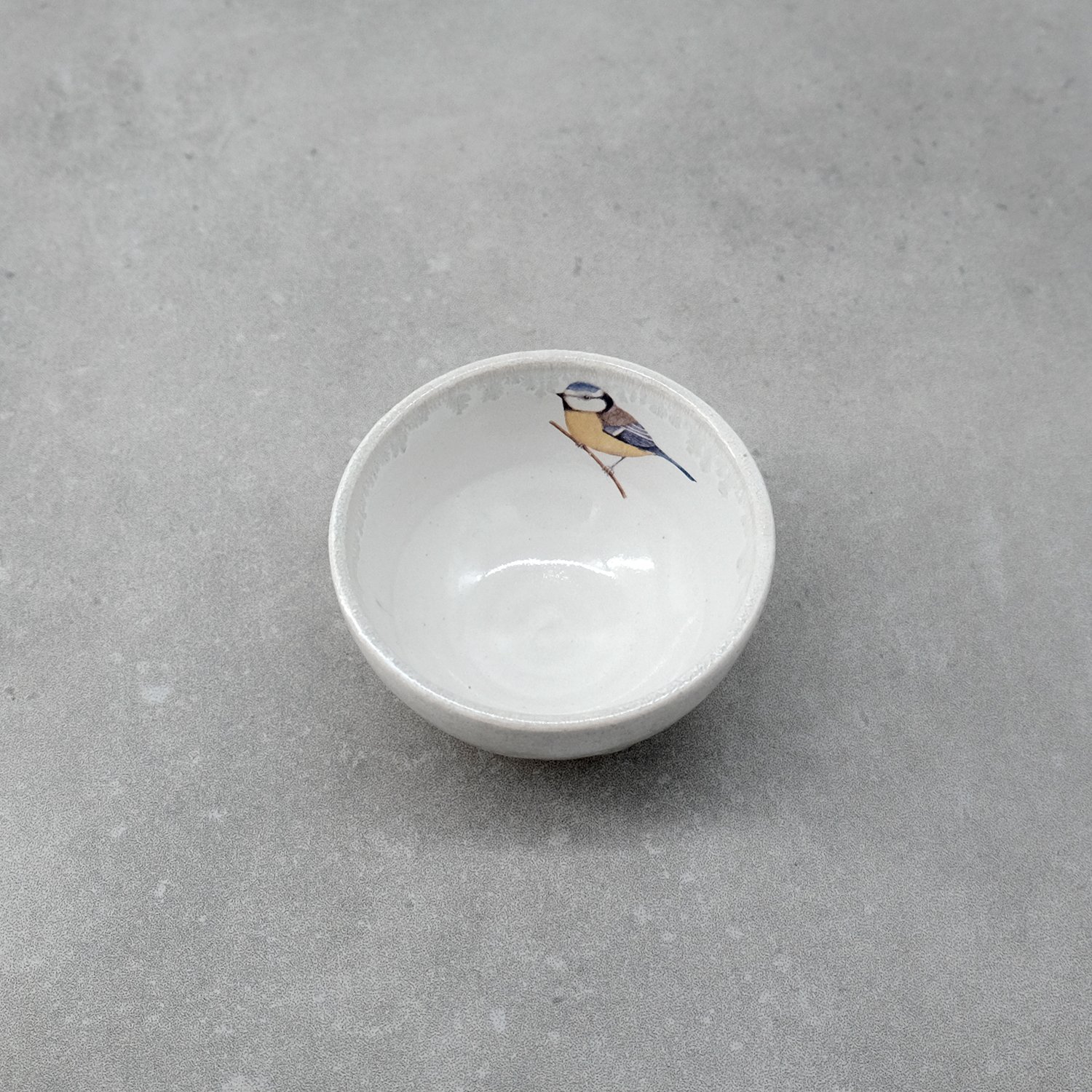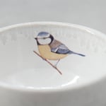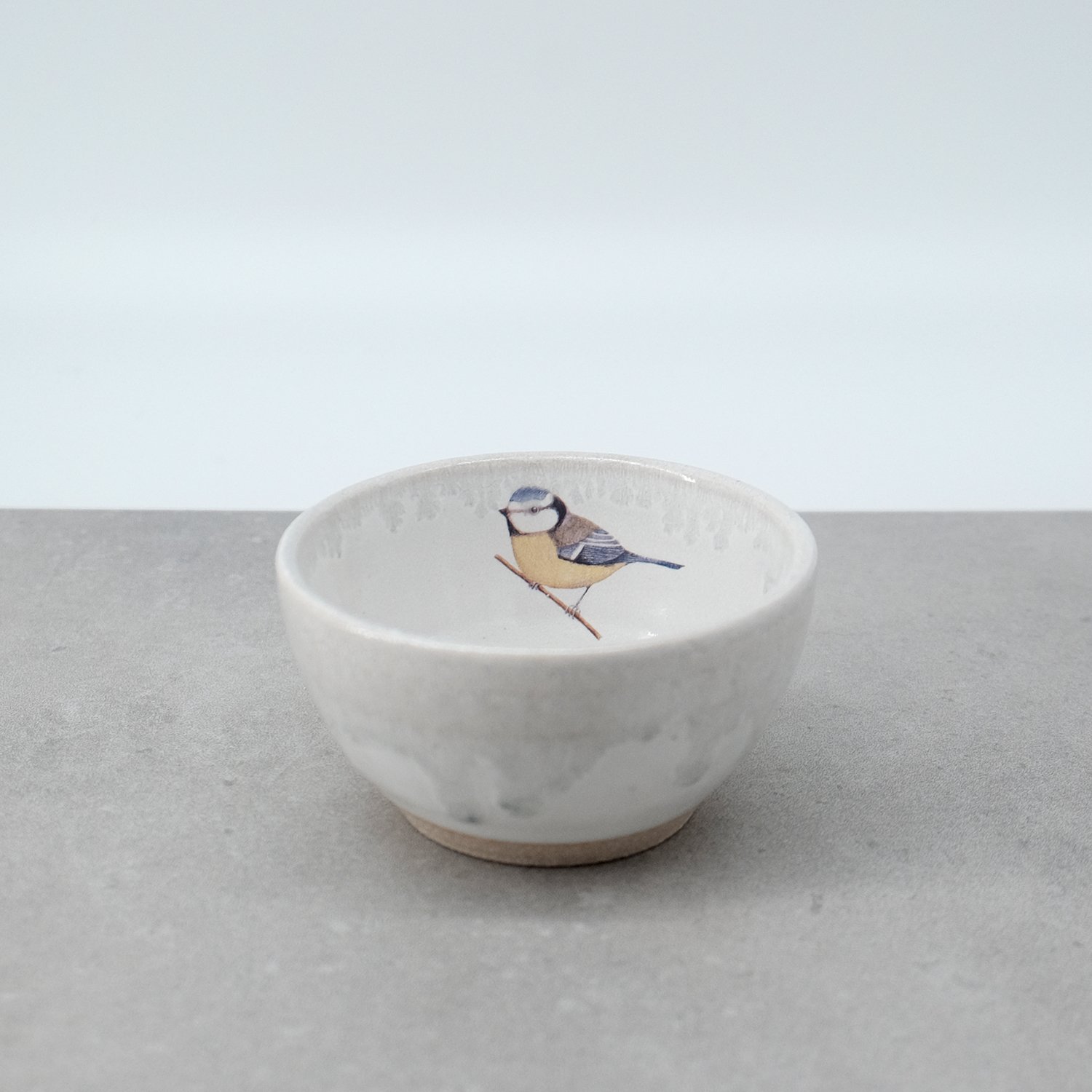 This bowl was individually wheel-thrown from vitrified stoneware clay. It is double-dipped in white and light grey toned glazes, creating gentle variations that make every piece unique. My blue tit illustration is reproduced as a decal and carefully fired onto the glazed surface.