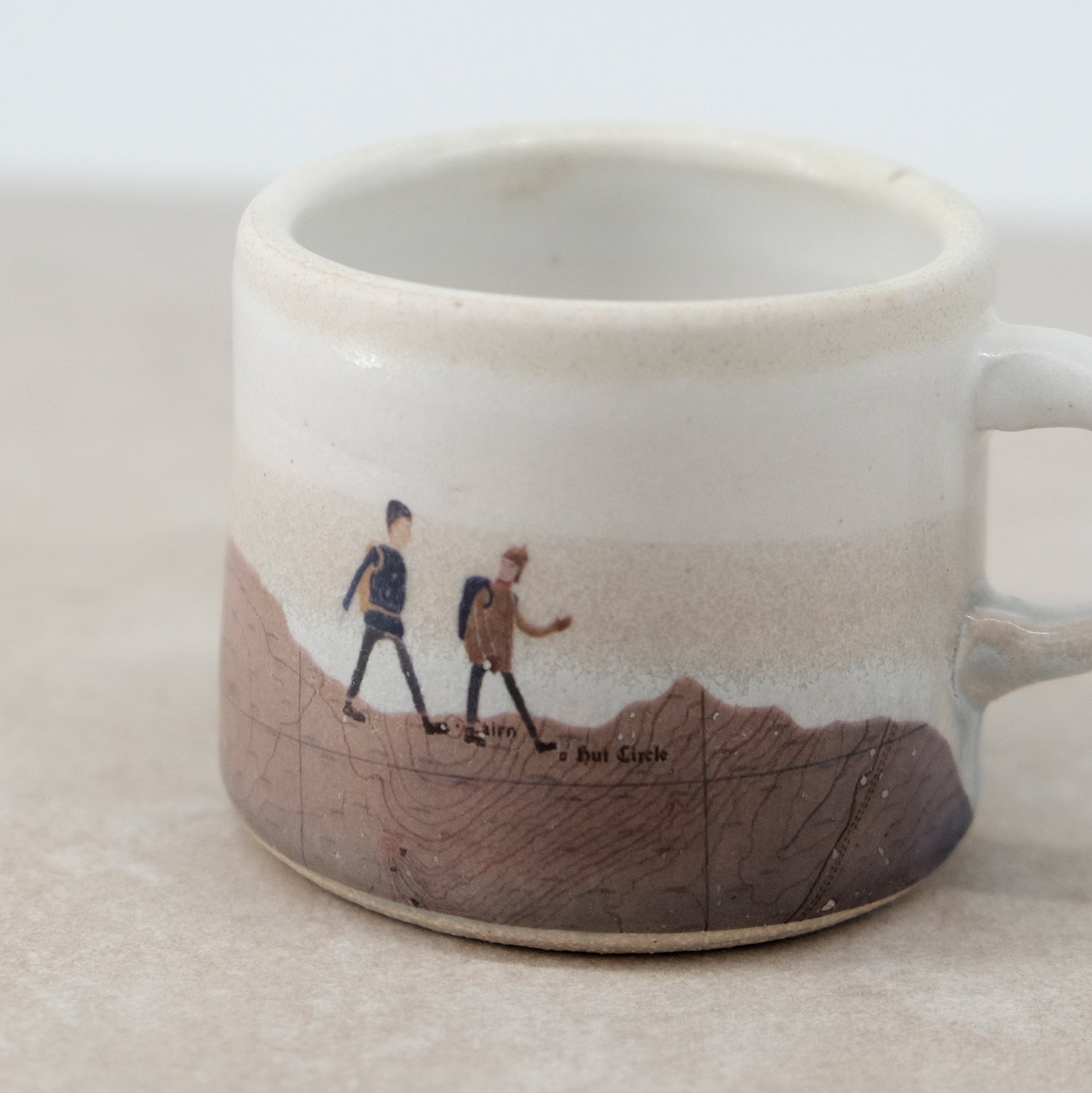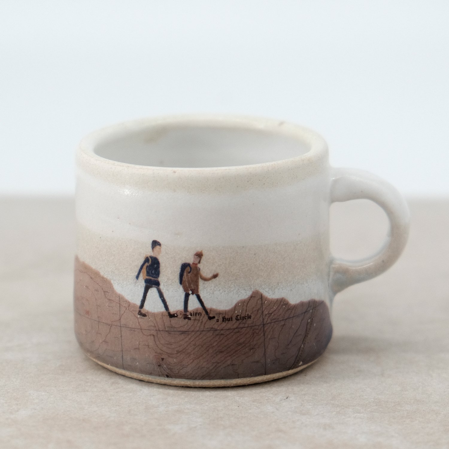 Each mug is individually wheel-thrown and hand-modelled from vitrified stoneware clay. It is double-dipped in white, cream and grey toned glazes, creating gentle variations that make every piece unique. My hikers illustration is reproduced as a decal and carefully fired onto the glazed surface.