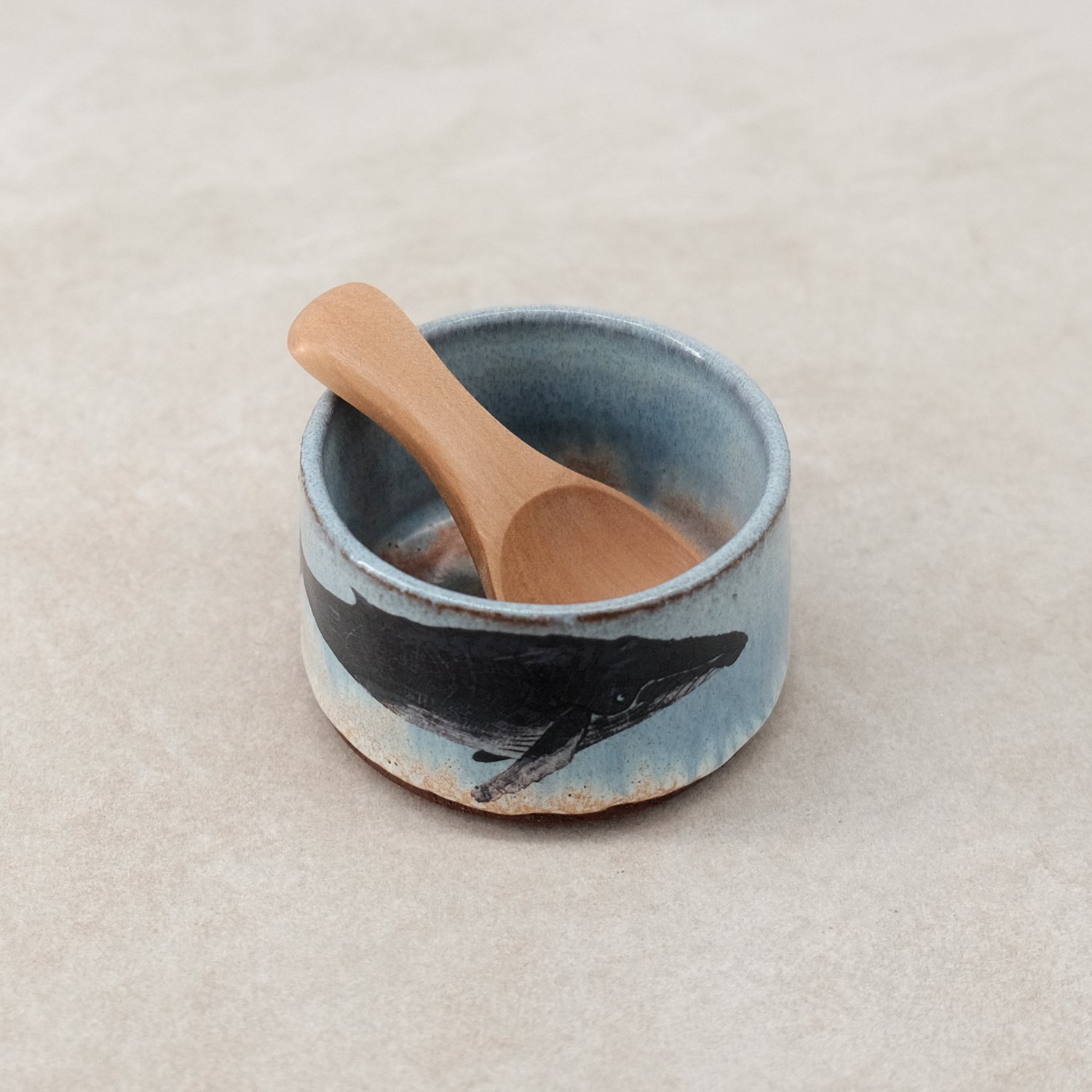 A small condiment bowl (see dimensions below), with a layered glaze finish and hand drawn decal print. A versatile little bowl for the kitchen with a small wooden serving spoon.