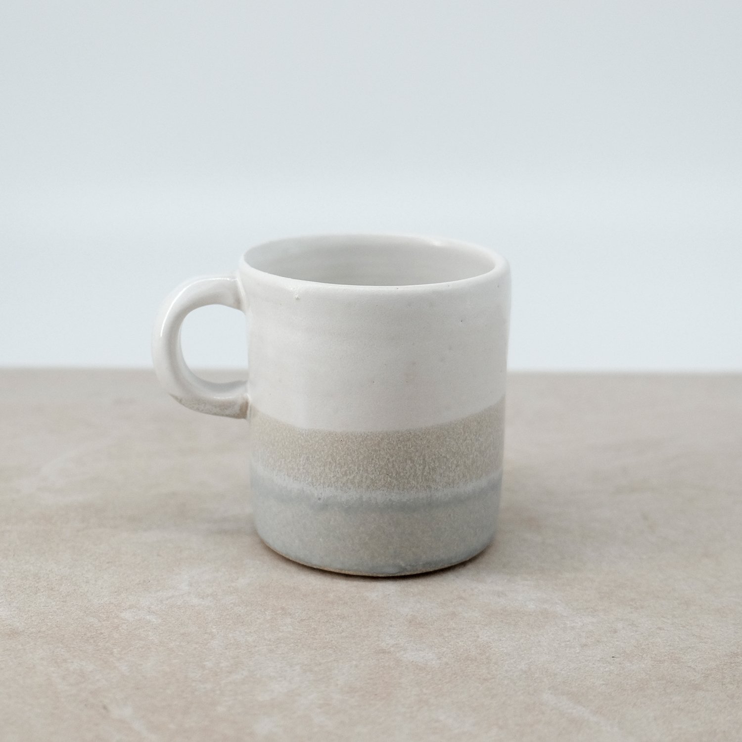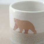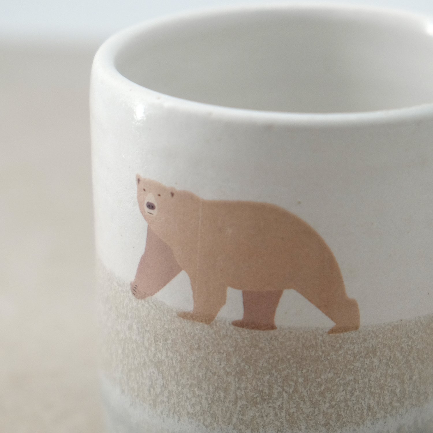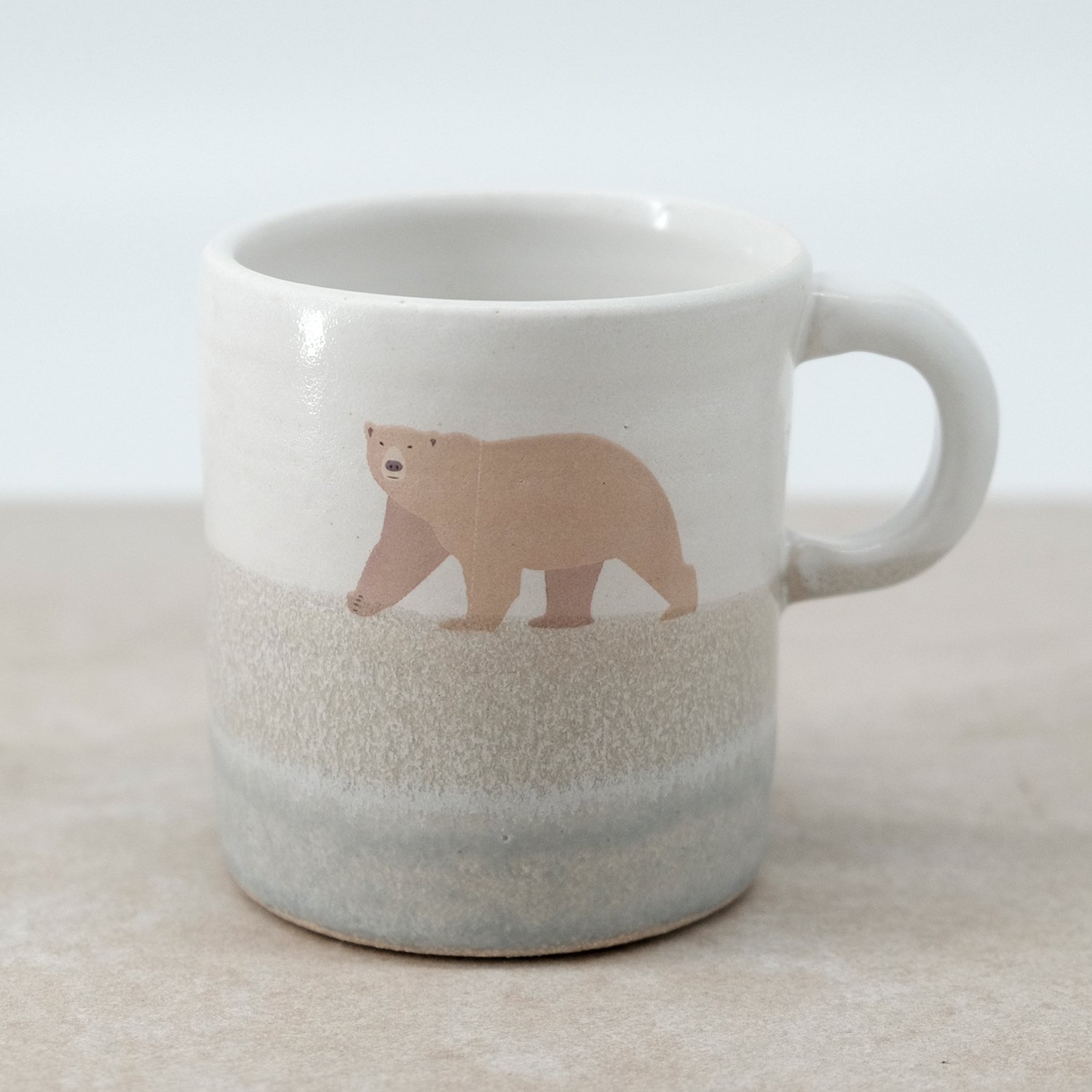 Each mug is individually wheel-thrown and hand-modelled from vitrified stoneware clay. It is double-dipped in white and grey toned glazes, creating gentle variations that make every piece unique. My polar bear illustration is reproduced as a decal and carefully fired onto the glazed surface.