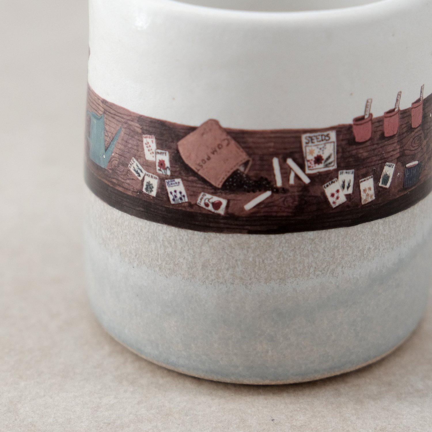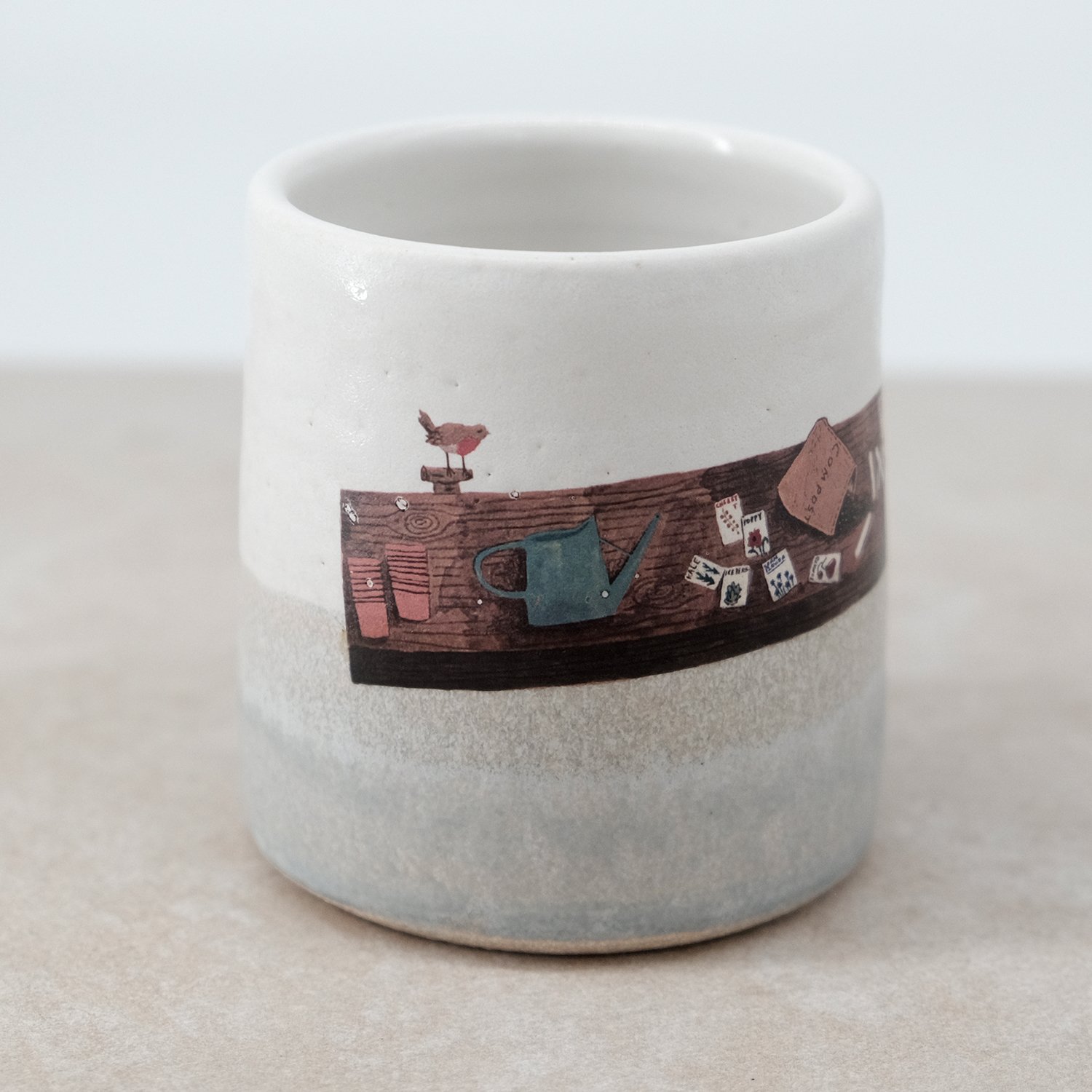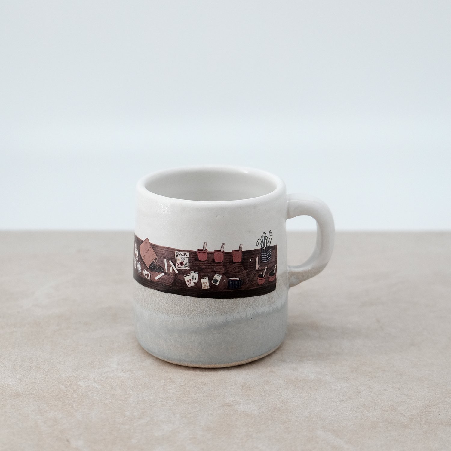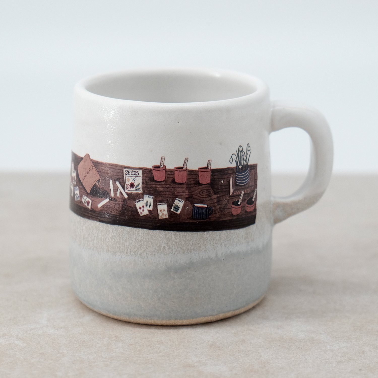 Each mug is individually wheel-thrown and hand-modelled from vitrified stoneware clay. It is double-dipped in white and grey toned glazes, creating gentle variations that make every piece unique. My seed table illustration is reproduced as a decal and carefully fired onto the glazed surface.