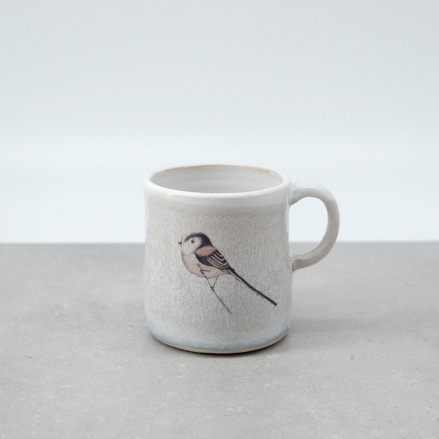 Each mug is individually wheel-thrown and hand-modelled from vitrified stoneware clay. It is double-dipped in white, cream and grey toned glazes, creating gentle variations that make every piece unique. My long tailed tit illustration is reproduced as a decal and carefully fired onto the glazed surface.