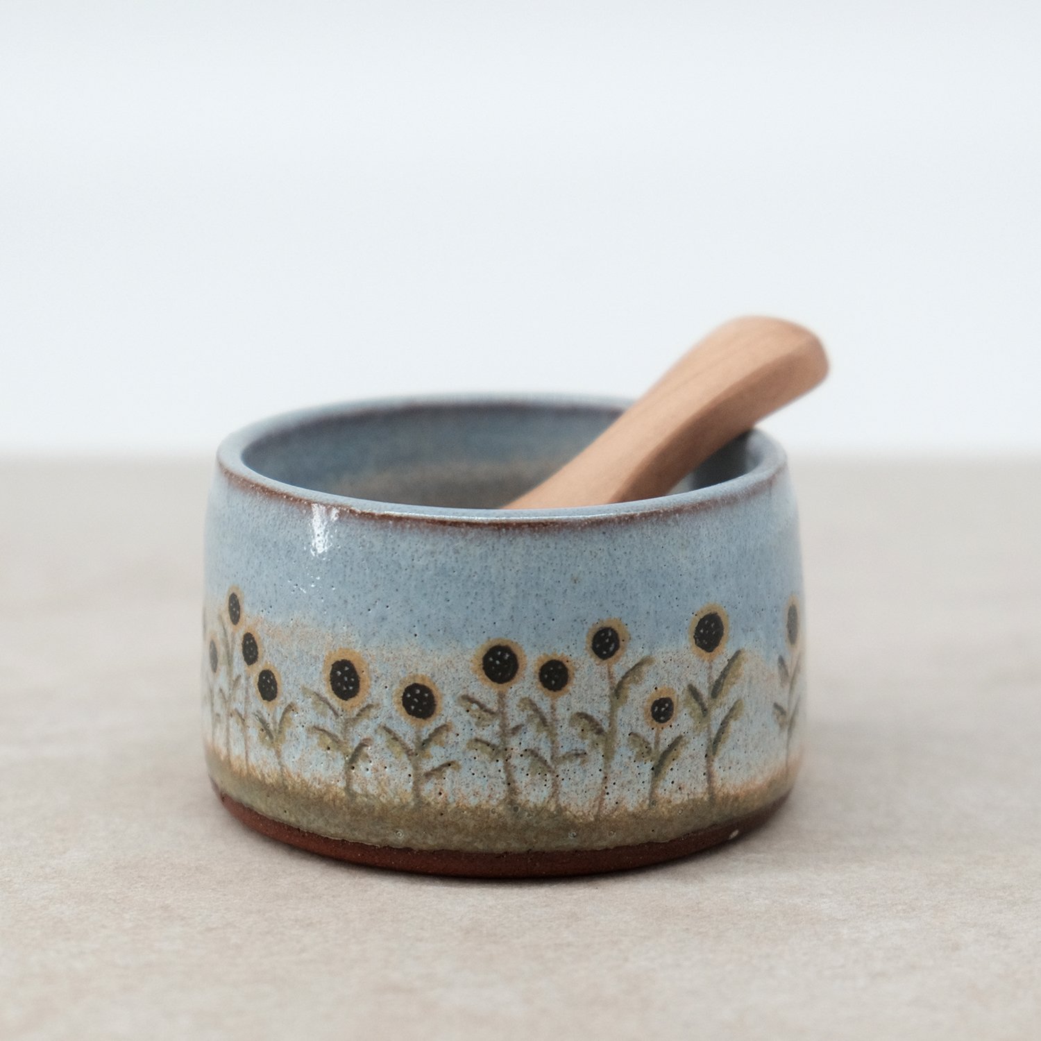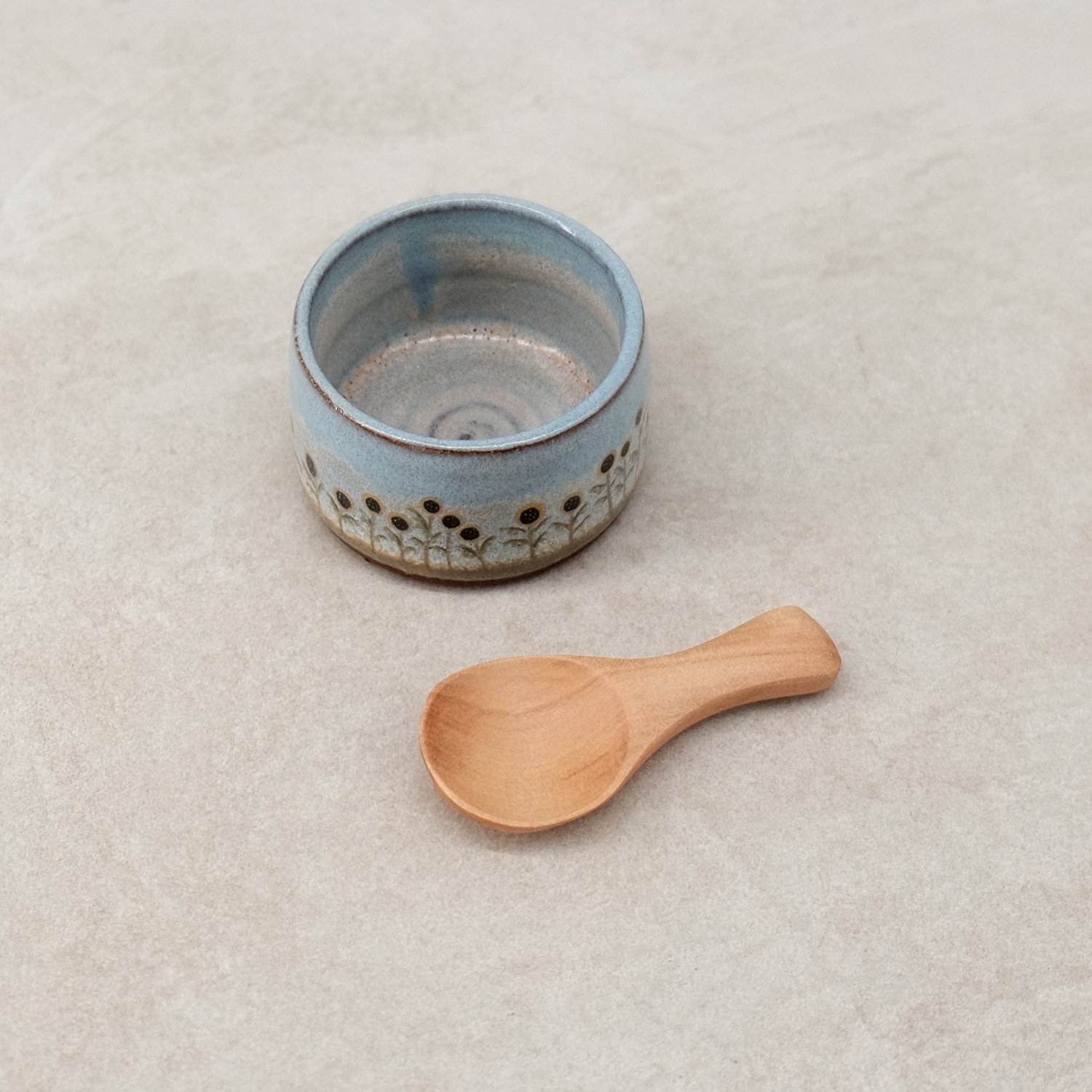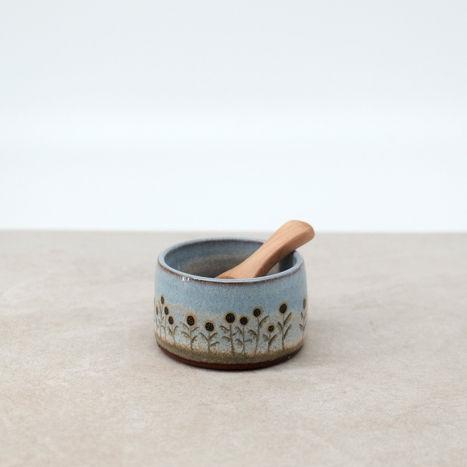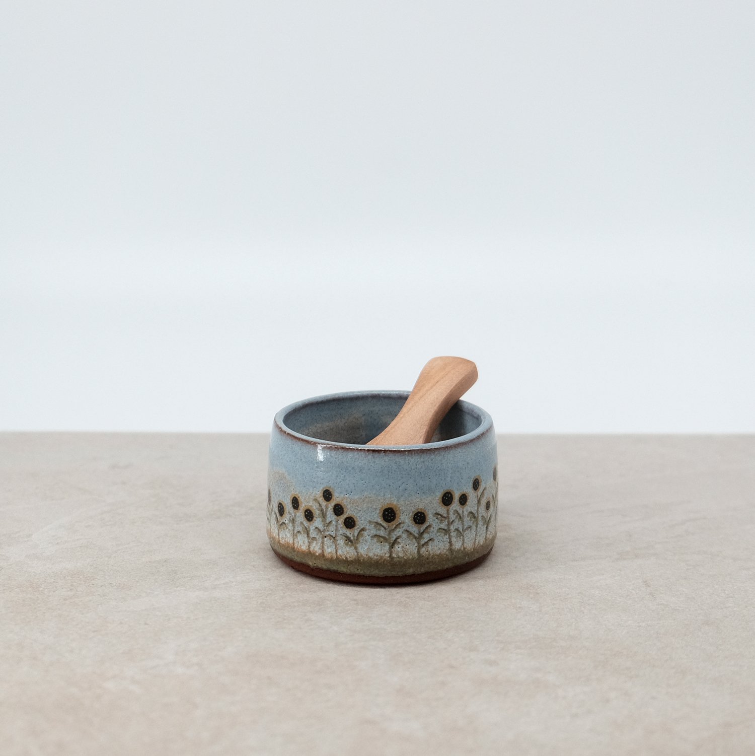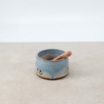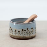 A small condiment bowl (see dimensions below), with a layered glaze finish and hand drawn decal print. A versatile little bowl for the kitchen with a small wooden serving spoon.