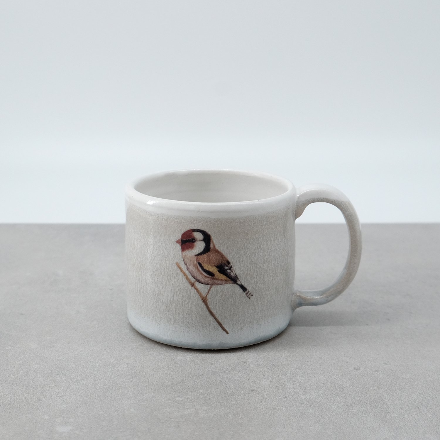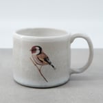 Each mug is individually wheel-thrown and hand-modelled from vitrified stoneware clay. It is double-dipped in white, cream and grey toned glazes, creating gentle variations that make every piece unique. My goldfinch bird illustration is reproduced as a decal and carefully fired onto the glazed surface.