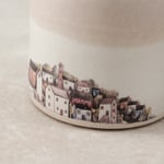 My coastal village illustration was reproduced as a decal and fired on to the glazed surface.