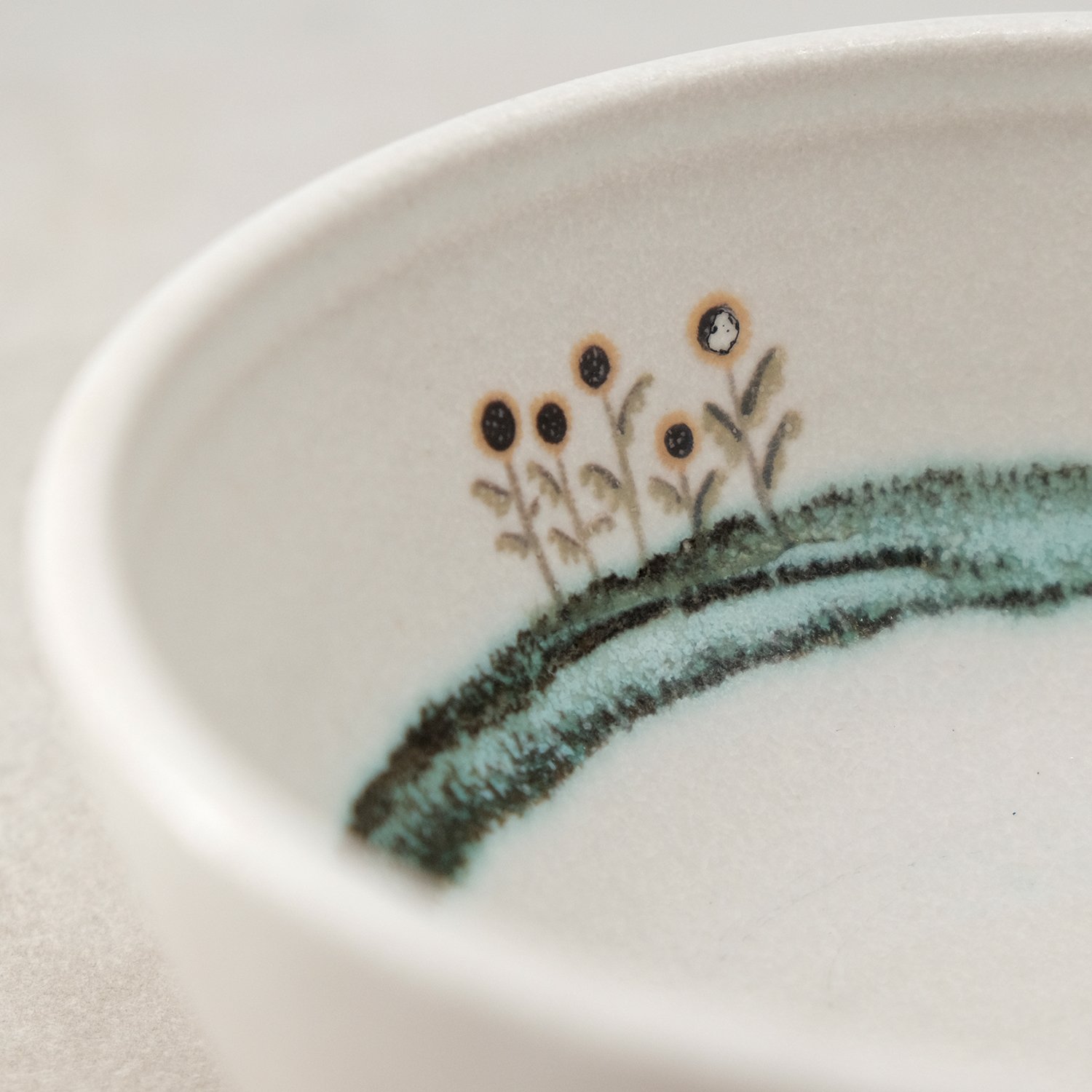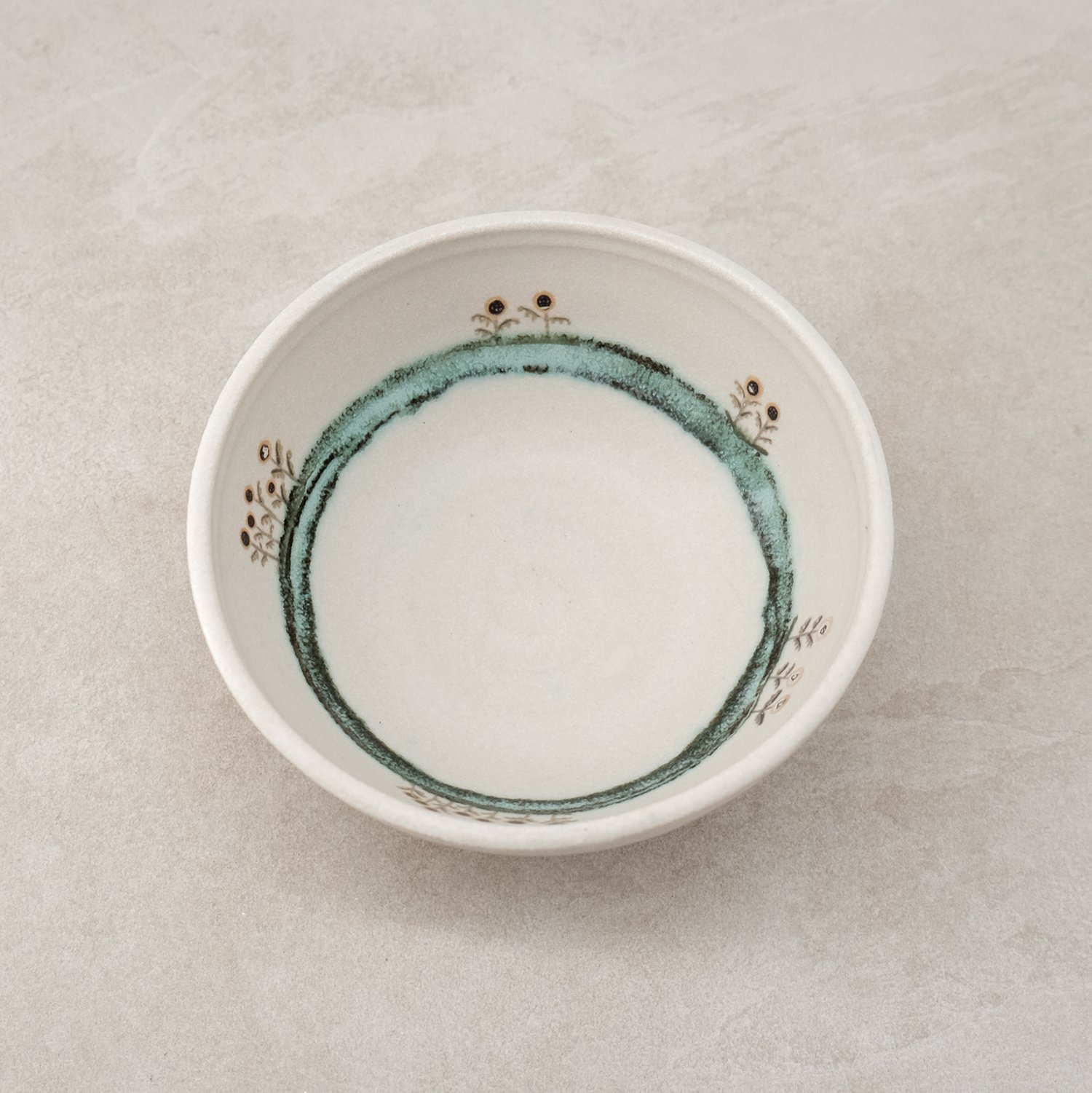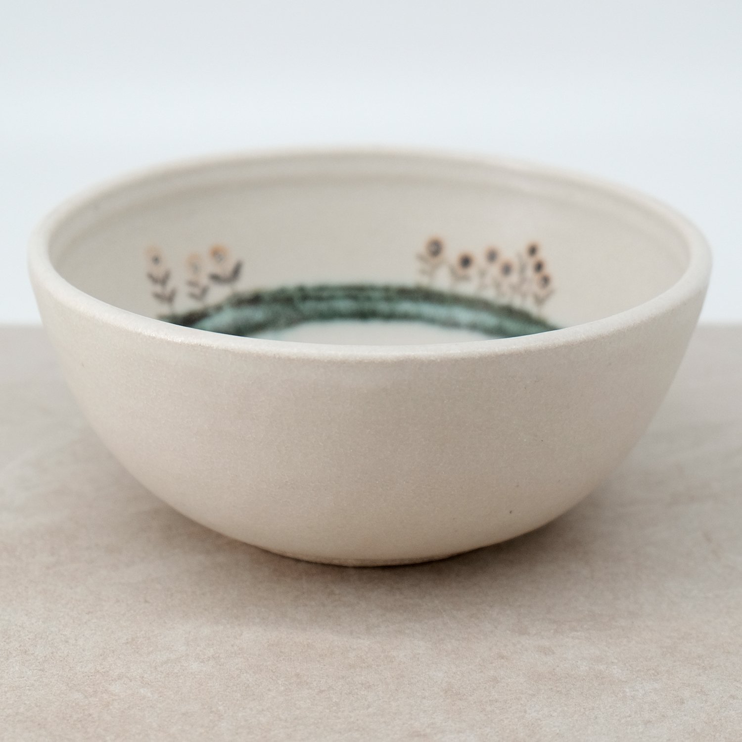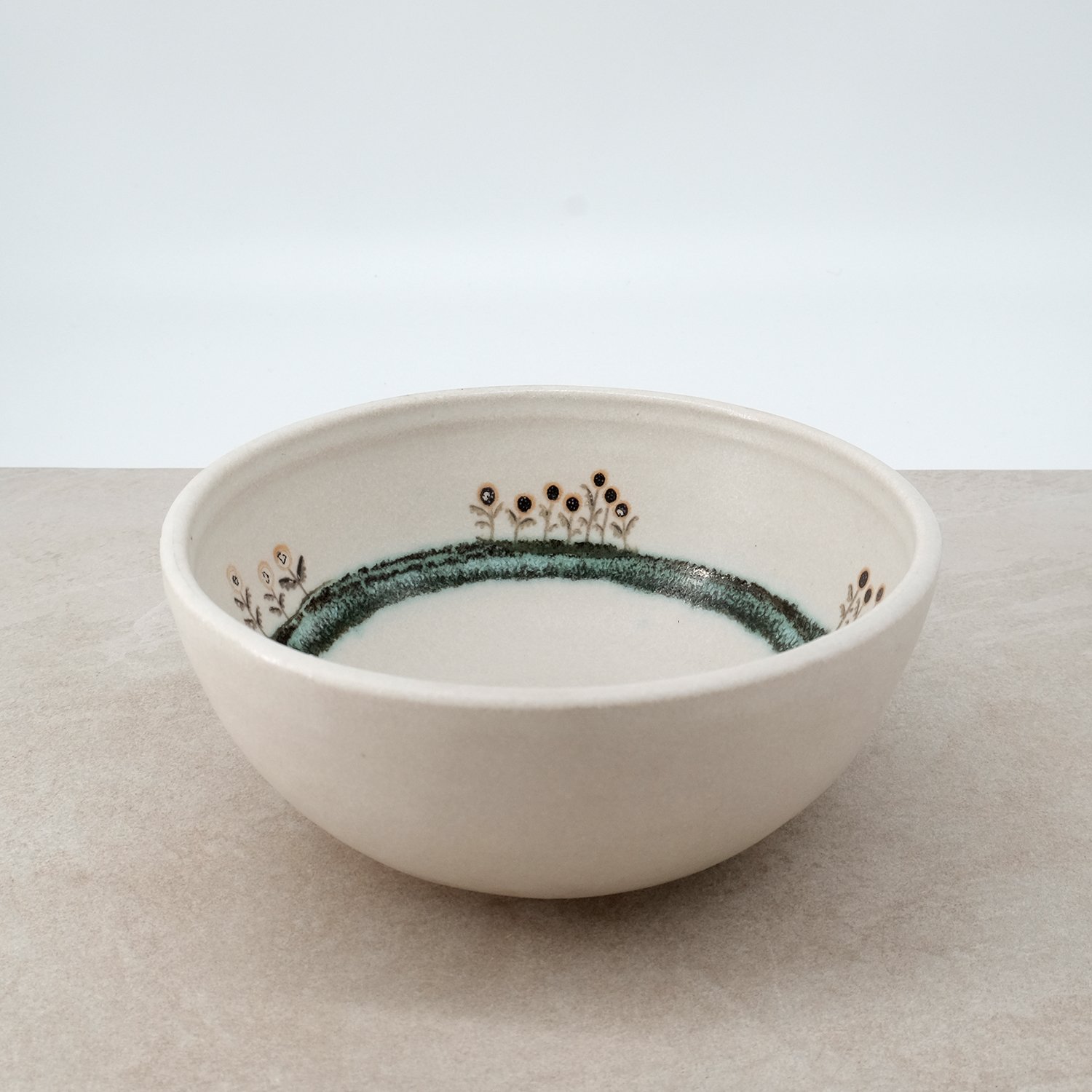 A simple bowl, with a layered glaze finish and hand drawn decal print. Perfect for a large breakfast, noodle or sharing snacks bowl. Please see dimensions below.