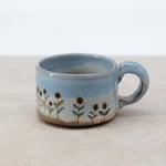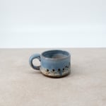 A small cup (see dimensions below), with a layered glaze finish and hand drawn decal print. Perfect for espresso.