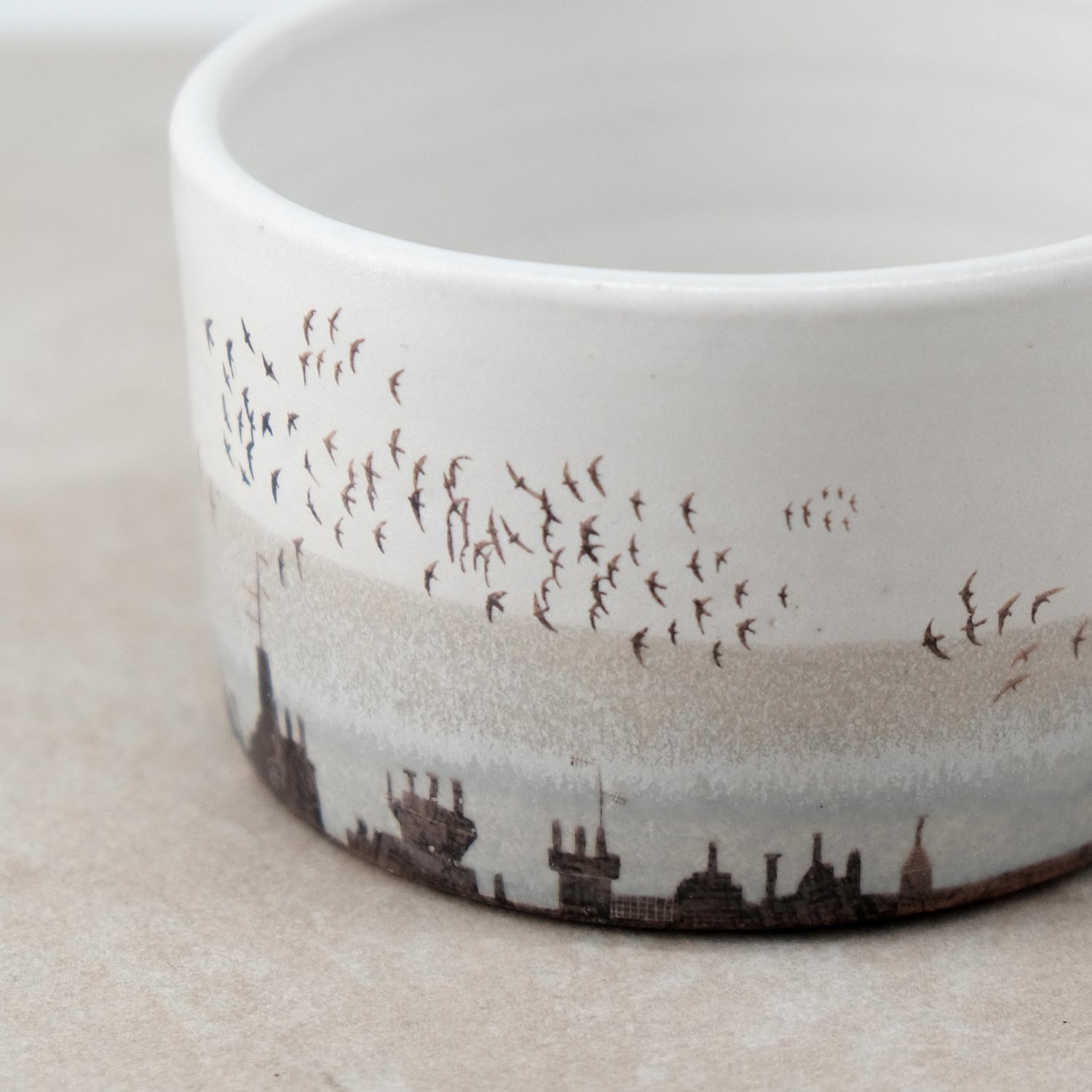 Each mug is individually wheel-thrown and hand-modelled from vitrified stoneware clay. It is double-dipped in white and grey toned glazes, creating gentle variations that make every piece unique. My swifts and rooftops illustration is reproduced as a decal and carefully fired onto the glazed surface.