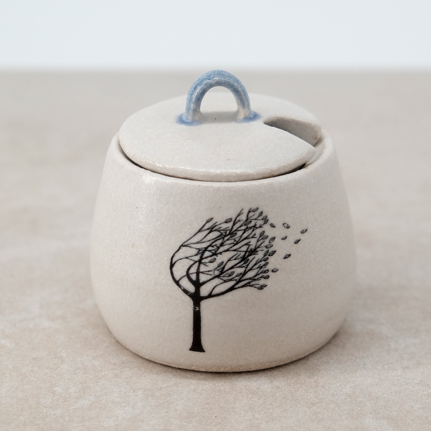 Each piece is individually wheel-thrown from stoneware clay and finished with soft stony white and blue toned glazes. My windy tree illustration is reproduced as ceramic decals and fired onto the glazed surface.