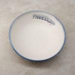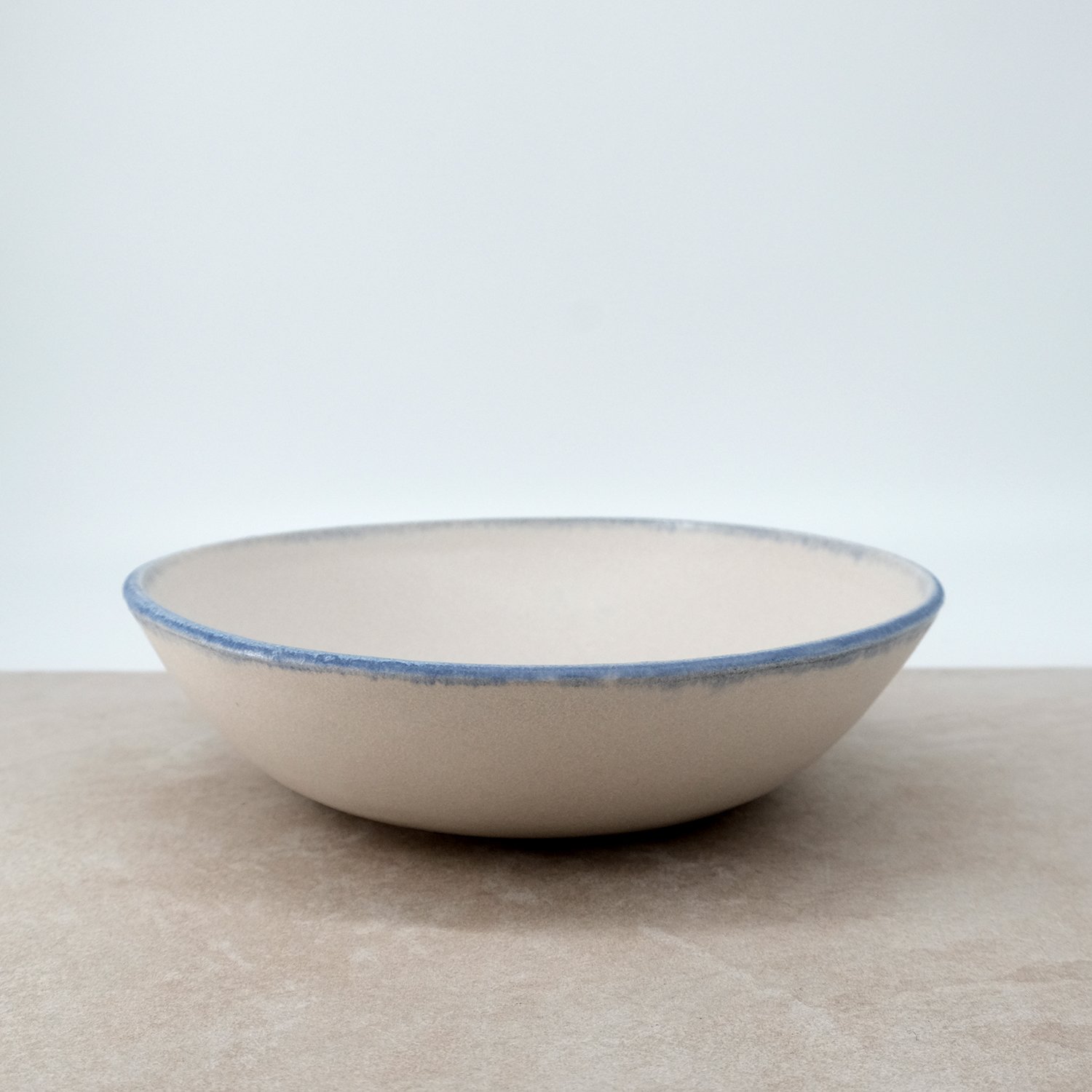 Individually thrown from white stoneware clay and double dipped in white and blue toned glazes.