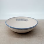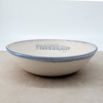 A large bowl, with a stony glaze finish and hand drawn decal print. Please see dimensions below.